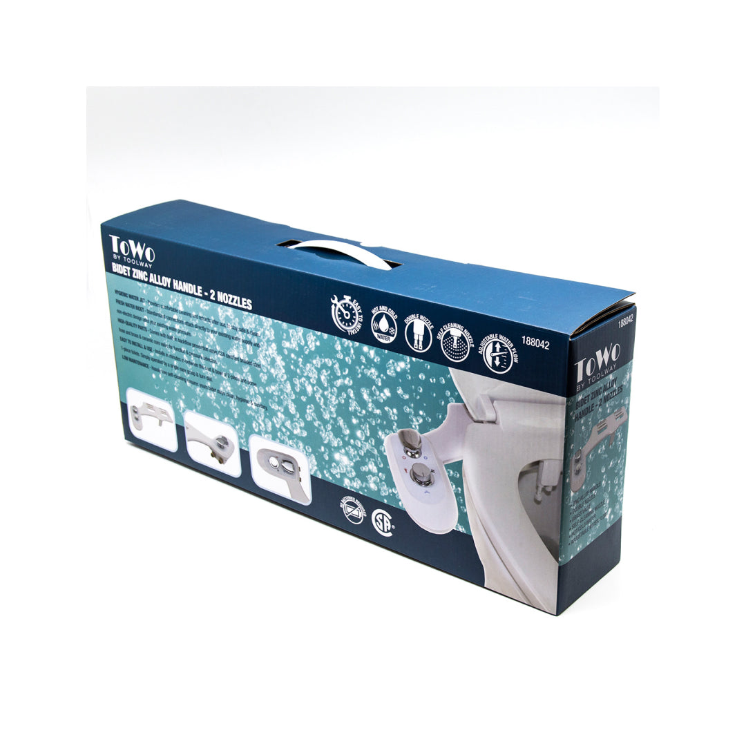 This double Nozzle unit allows you to quickly and affordably turn your existing toilet into a hygienic bidet. It can be easily installed in minutes in-between the seat and bowl of most 2-piece and some 1-piece toilets with the included hardware kit and CSA certified braided steel Hose. Standardized connections attach directly to most water supply lines and its simple single easy grasp & turn dial makes operation a breeze. The double Nozzle design allows for hot water Hook-Up increasing comfort level for the user. A brass and ceramic core valve increases function and allows for proper pressure selection and all units come with a built-in back-flow protector. This bidet provides comfortable cleaning then retracts after use to stay safe. Hassle-free self-cleaning ability ensures it stays clean, hygienic and sanitary until the next time It is needed.