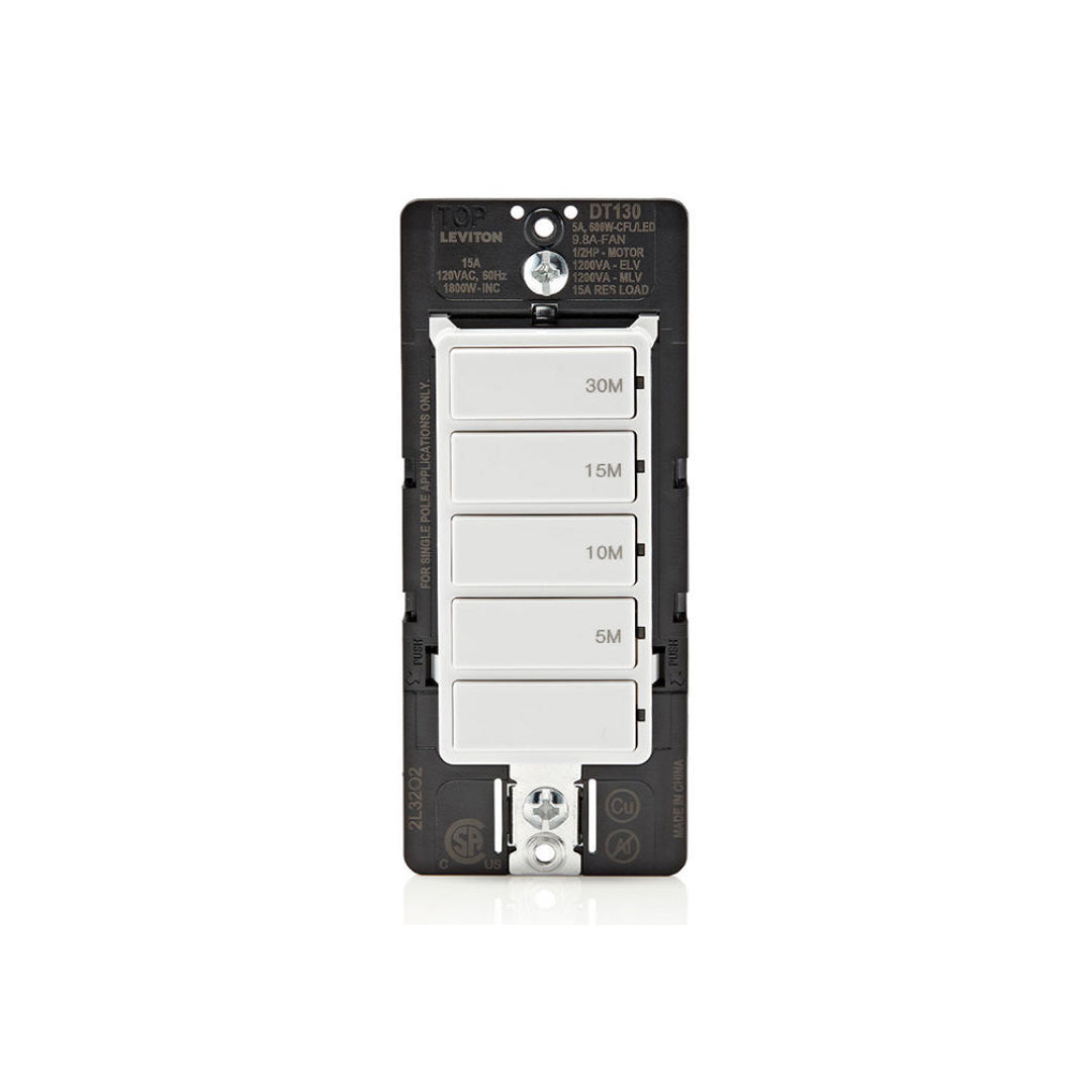 The Decora 30-Minute Countdown Timer Switch has 5 buttons with 5-minute, 10-minute, 15-minute and 30-minute preset time options and a manual off button. Single Pole, 600W LED/CFL, 1800W Incandescent/Halogen, 1200VA Magnetic Low Voltage/Electronic Low Voltage/Fluorescent, ½ HP/9.8A Fan/Motor, 15A Resistive. Can be installed with or without a neutral wire, wallplate sold separately - White