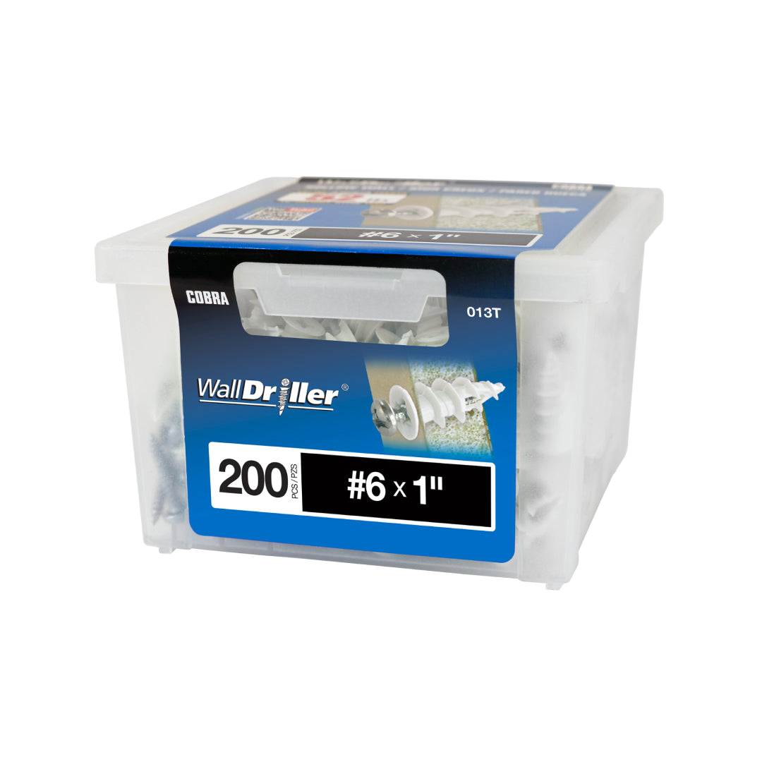 The WallDriller® is designed to offer the maximum holding power in drywall material. Its fine centered point helps guide the anchor into the wall with flawless precision. A sharp profile thread cuts deeply into the hole without damaging the drywall, ensuring maximum holding power and stability. The sharp cutting edge reduces the force required to cut the material, making it a self-drilling anchor without pre-drilling. Available in #6 and #8L, in both nylon and zinc.