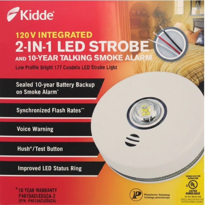 The Kidde P4010ACLEDSCA is an integrated 120 V AC wire-in smoke alarm with 10-year sealed battery backup and LED strobe light that provides temporal patterns, visual and voice warnings. The model P4010ACLEDSCA is equipped with a 177 candela strobe light (powered by Cree® LEDs), designed to notify the deaf and hard of hearing. The unique design measures only 5.8 cm (2.3”) in height, when mounted.