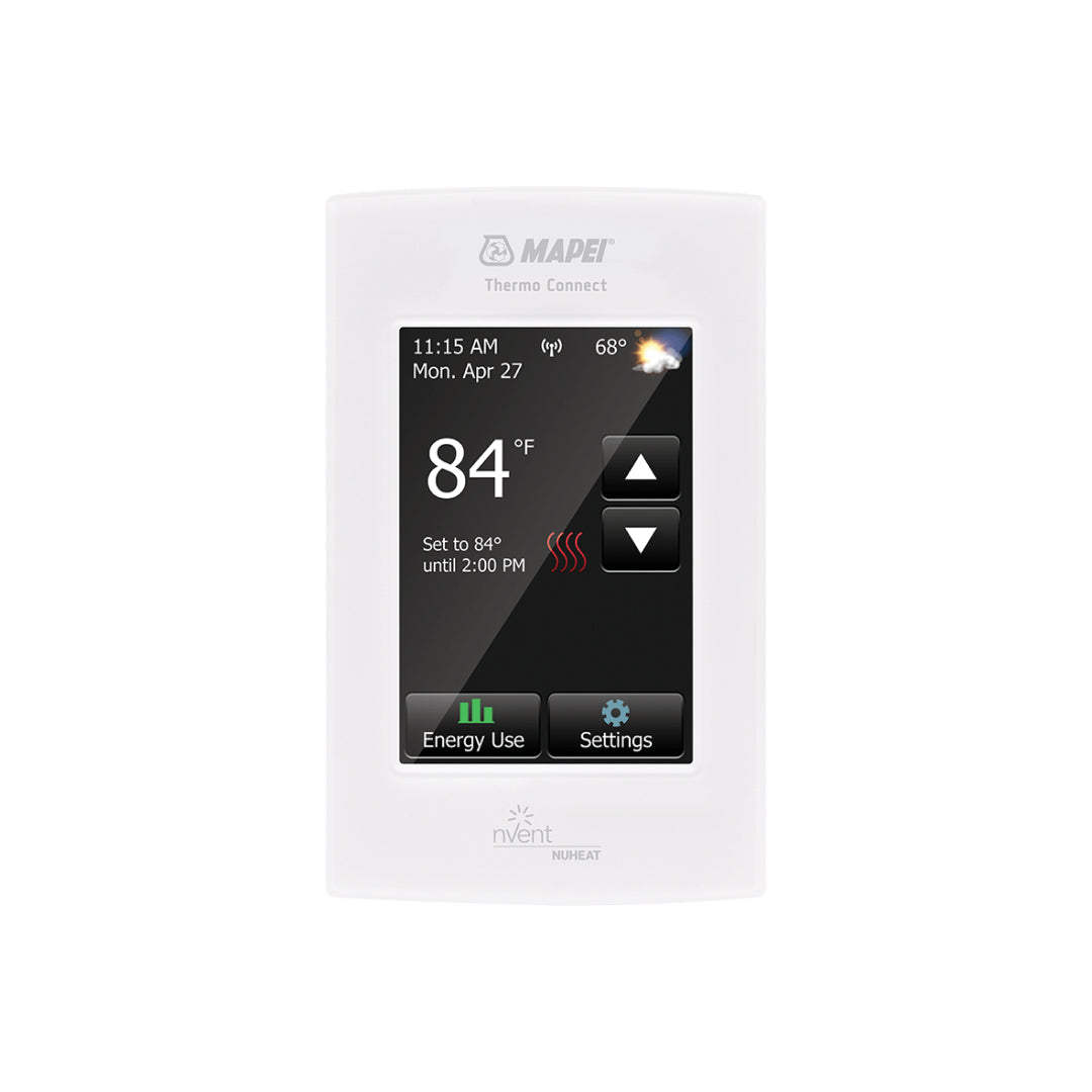 The thermostat also provides homeowners with useful information such as energy usage and weather forecasts. The Mapeheat Thermo Connect thermostat features 7-day programmability, dual-voltage compatibility (120 V and 240 V) and built-in GFCI protection (Class A). The exclusive design features a high-gloss frame and a borderless clear acrylic that blends into any modern room decor.