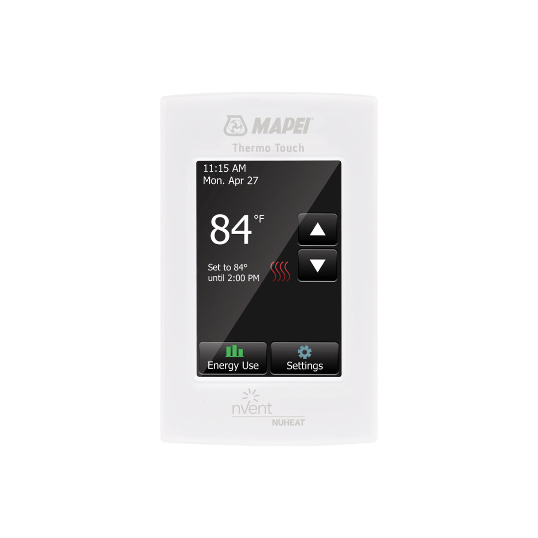 Mapeheat Thermo Touch thermostat is a 7-day programmable, electric floor-heating thermostat that features a 3.5" (9 cm) color touchscreen display for accessing the super-intuitive user interface and energy use monitor. The thermostat features dual-voltage compatibility (120 V and 240 V), a physical on/ off switch and built-in GFCI protection (Class A).