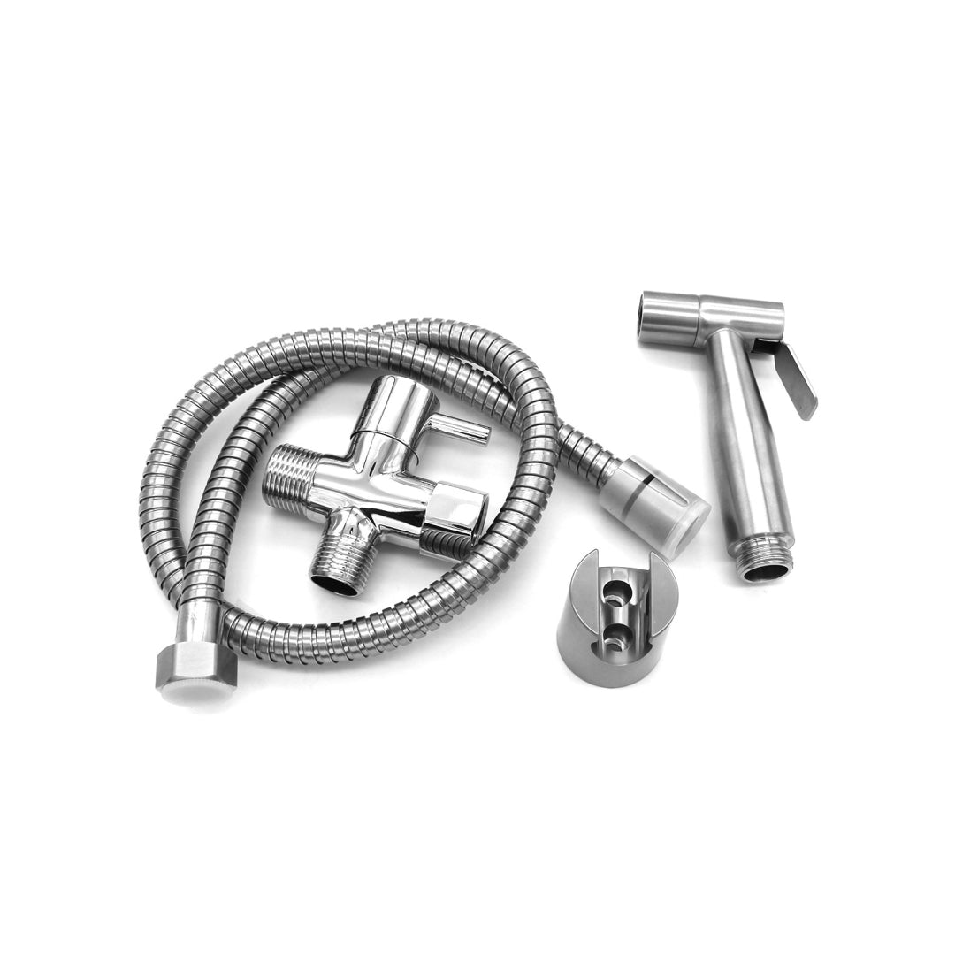 This stainless-steel hand-held sprayer allows you to quickly and affordably turn your existing toilet into a hygienic bidet. With built in water pressure control, This unit can also function as a cloth diaper sprayer or assist in rinsing out your toilet bowl when cleaning. The included 7/8” chromed cold water t-adapter will fit most standard water lines and the multi-piece hardware kit makes installation A breeze. Also comes with a wall mount bracket for sprayer Docking and a 30” braided hose for an extended reach.