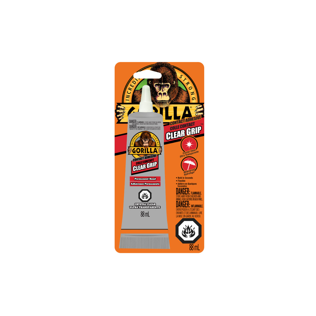 Gorilla clear grip is a flexible; fast-setting; crystal clear contact adhesive that creates a strong; permanent bond. gorilla clear grip is paintable and waterproof making it great for projects both inside and out! build; create; repair.