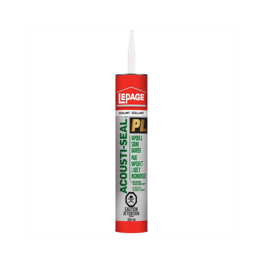 LePage PL Acousti-Seal Vapour Barrier & Sound Reduction Adhesive is made with a unique blend of synthetic rubber and polymers to bond polyethylene vapour barrier films to metal, concrete, masonry, asbestos, gypsum, board, plaster, and wood.