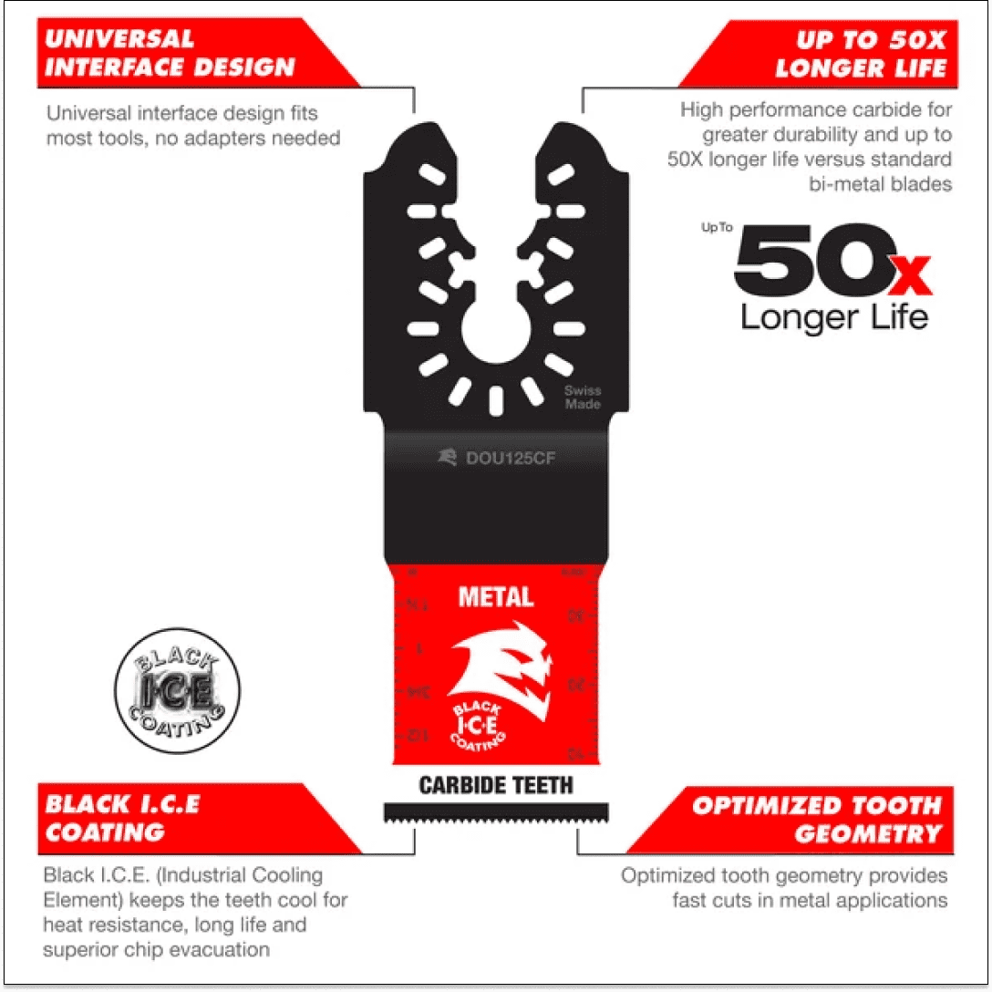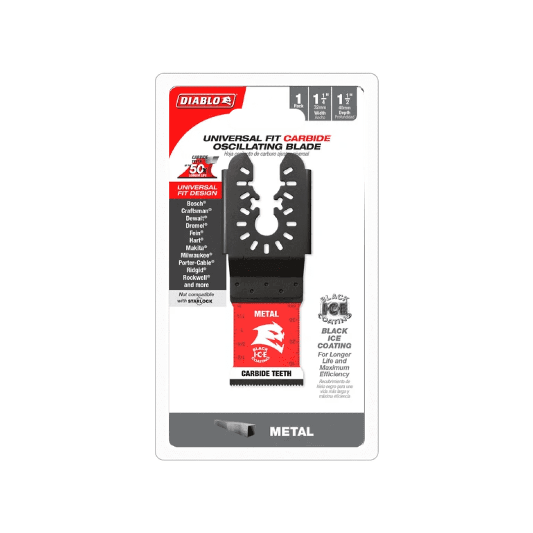 Diablo’s universal fit carbide oscillating blades feature application specific designs that deliver extreme durability and superior cutting life in metals. High-performance carbide teeth deliver an unmatched up to 50X longer cutting life versus standard bi-metal blades. An optimized blade and tooth design along with Black I.C.E. (Industrial Cooling Element) protects the blade's cutting edge against wear for extreme durability and longer blade life. The blade’s universal fit, adapter-free design easily attaches to most tools, with the exception of Starlock tools.