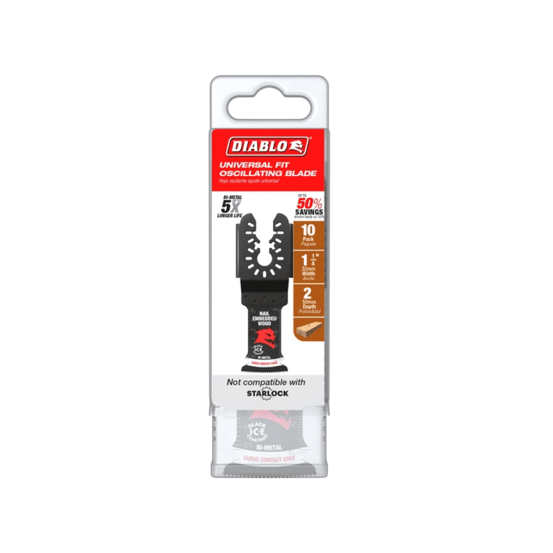 Diablo’s Demo Demon™ universal fit bi-metal oscillating blades feature application specific designs that deliver maximum durability and longer life in nail-embedded wood applications. These high-performance blades feature an ultra-hardened cutting edge to deliver up to 5X longer life than standard blades. Curve contact edge creates a pilot for precise, clean plunge cuts with less vibration. Black I.C.E. (Industrial Cooling Element) coating protects cutting edge against wear for extreme durability and longer blade life. The blade’s universal fit, adapter-free design easily attaches most tools, with the exception of Starlock tools.