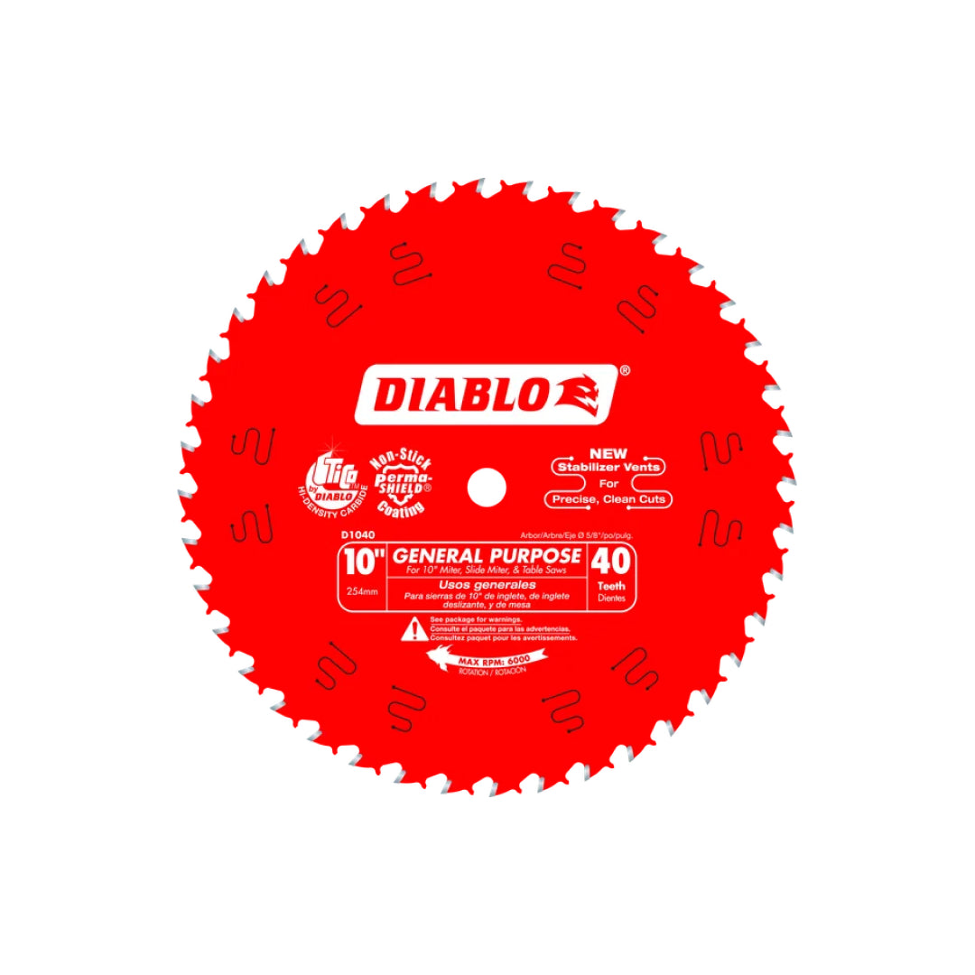 Diablo's general purpose saw blade is ideal for cutting oak, pine, plywood, pressure treated lumber and beams. An excellent choice for table & miter saws, Diablo's blade leaves a smooth cut in a variety of applications, reducing the need to change blades between tasks. Use it for rip cuts with a smoother finish than dedicated ripping blades, or make quality crosscuts in solid wood or plywood. Great for both sliding and “chop” style miter saws as well as table saws.