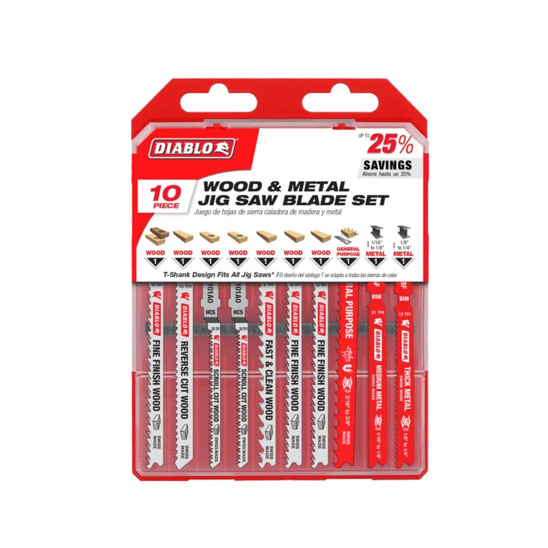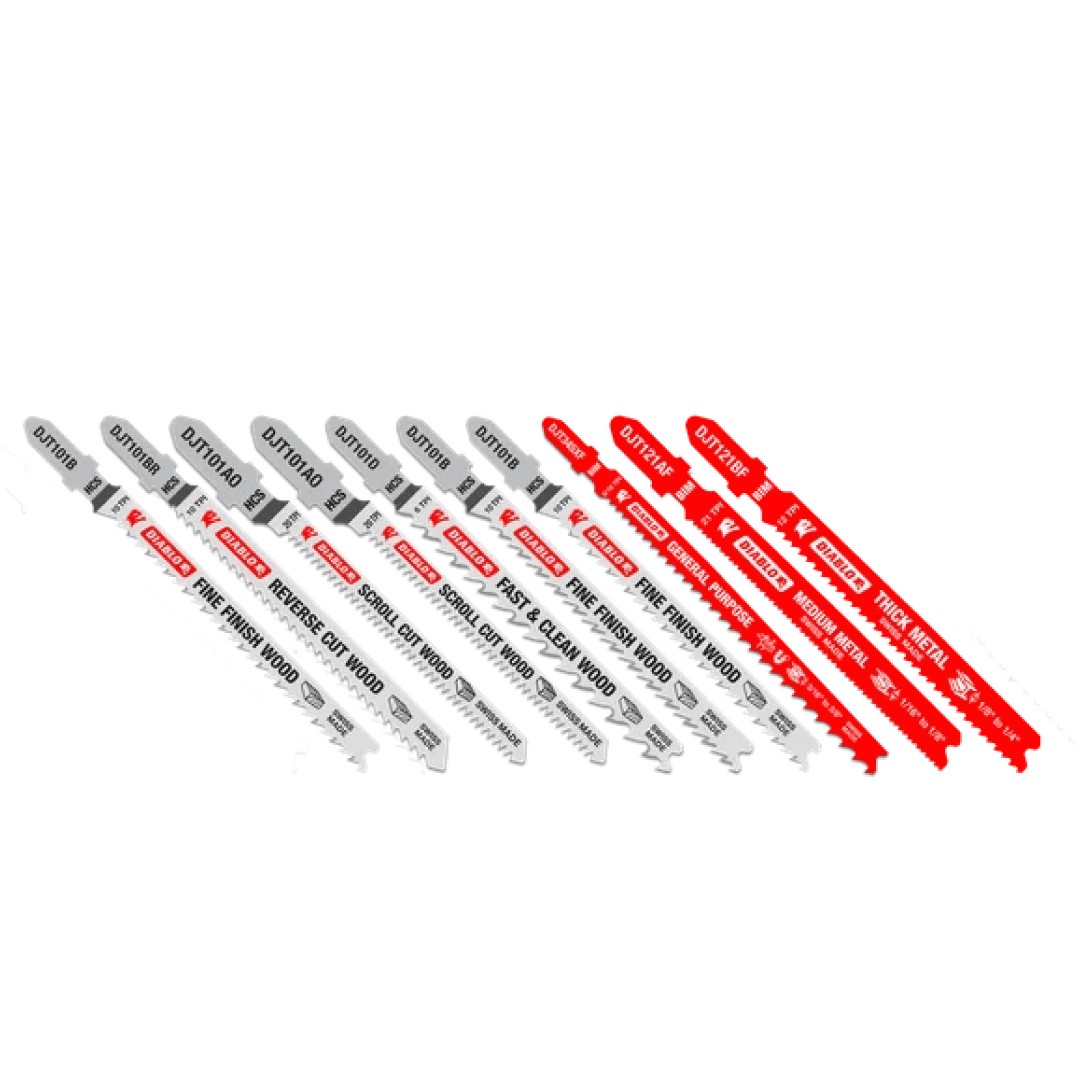 Diablo’s jig saw blades are designed for superior performance and longer cutting life in wood, metal and plastics. This 10-piece set features a range of blades, including bi-metal for clean wood, nail-embedded wood, metal and plastics; high carbon steel for soft woods, and high speed steel for metal. Each blade included in this set is optimized to deliver effortless, clean cuts. T-shank design fits all combo and most U-shank cordless and corded jig saws.