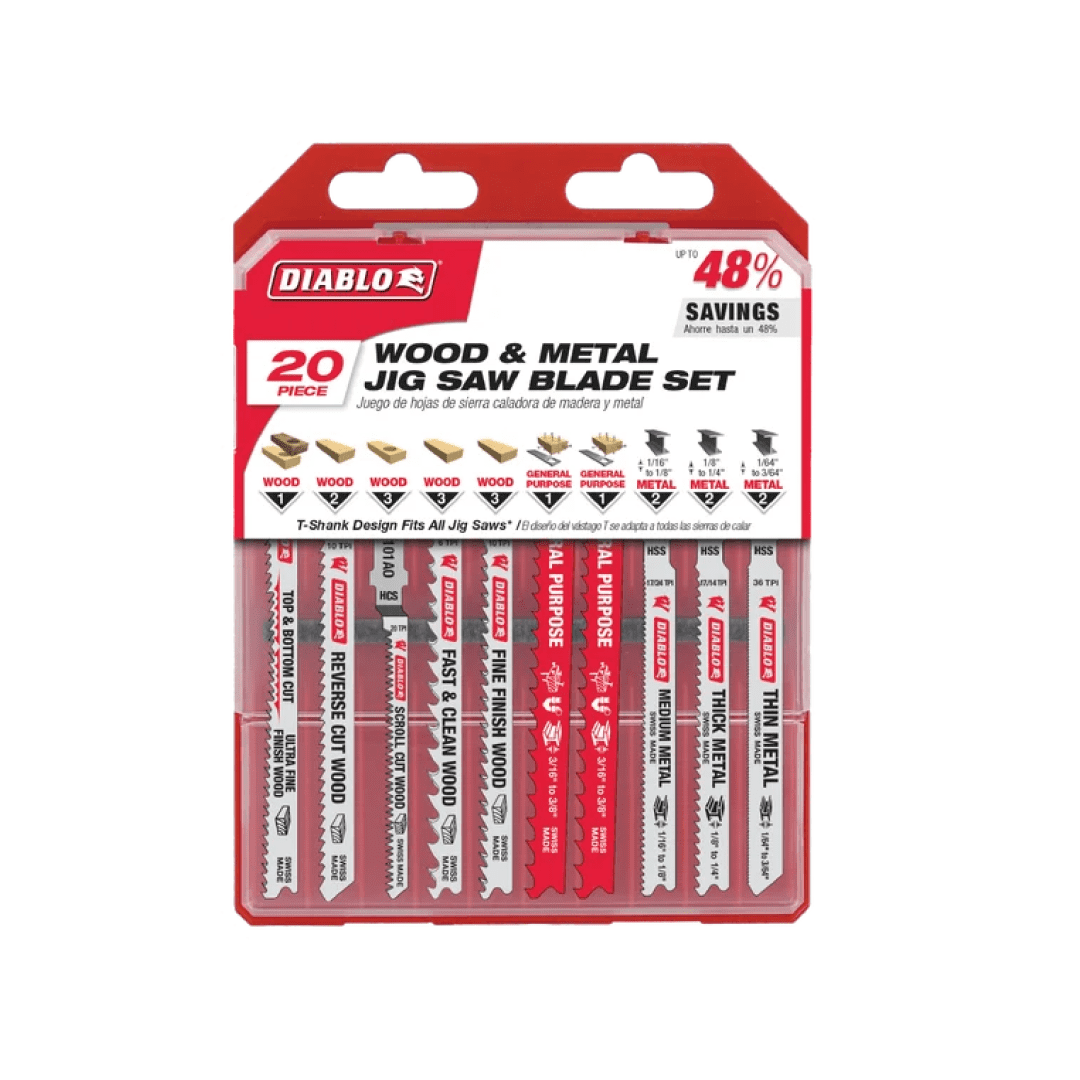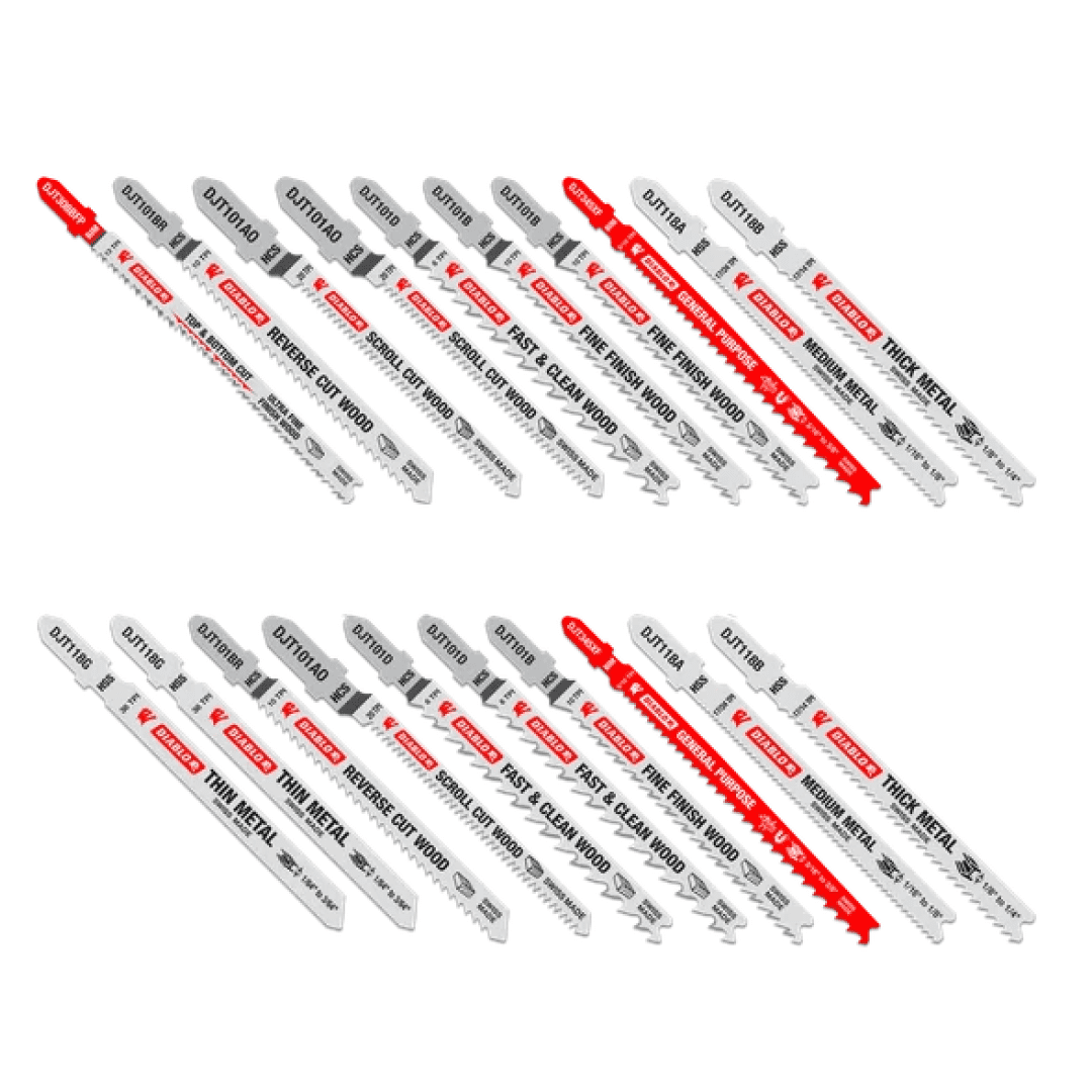 Diablo’s jig saw blades are designed for superior performance and longer cutting life in wood, metal and plastics. This 20-piece set features a range of blades, including bi-metal for clean wood, nail-embedded wood, metal and plastics; high carbon steel for soft woods, and high speed steel for metal. Each blade included in this set is optimized to deliver effortless, clean cuts. T-shank design fits all combo and most U-shank cordless and corded jig saws.