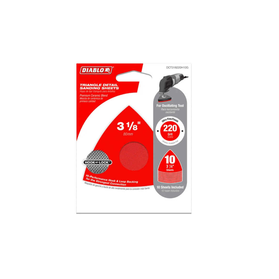 Diablo's premium triangle detail sanding sheets with Hook & Lock™ backing include breakthrough innovations that improve performance, extend sanding life and increase productivity. Featuring a premium ceramic blend, these discs remove material faster and offer extra-long sanding life than other sanding discs. Clog-SHIELD™, Diablo's own blend of grinding agents, reduces loading thus maximizing productivity. The superior grain bonding system, ENDURA-BOND™, provides Diablo's sanding discs with longer life and extreme durability.