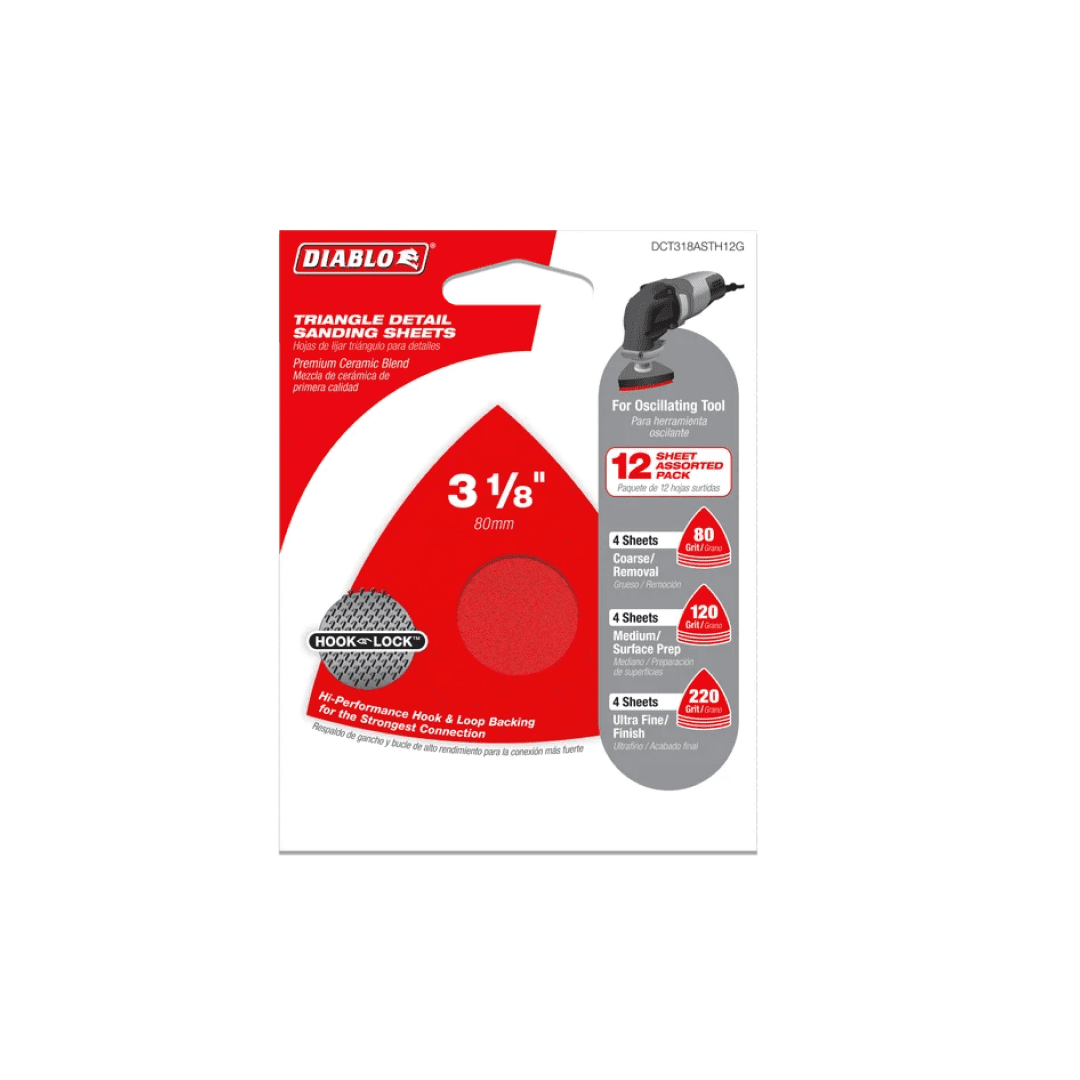 Diablo's premium detail triangle sanding sheets with Hook & Lock™ backing include break-through innovations that improve performance, extend sanding life and increase productivity. Featuring a premium ceramic blend, these discs remove material faster and offer extra-long sanding life than other sanding discs. Clog-SHIELD™, Diablo's own blend of grinding agents, reduces loading thus maximizing productivity. The superior grain bonding system, ENDURA-BOND™, provides Diablo's sanding discs with longer life and extreme durability.