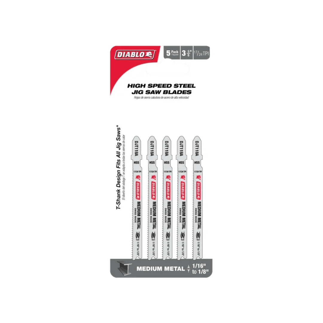 Diablo’s high speed steel jig saw blades are specifically designed for high-performance cutting in medium metal applications. A high speed steel cutting edge and optimized tooth design provide fast cuts and stability in metal from 1/16”-1/8”. T-shank design fits all combo and most U-shank cordless and corded jig saws.