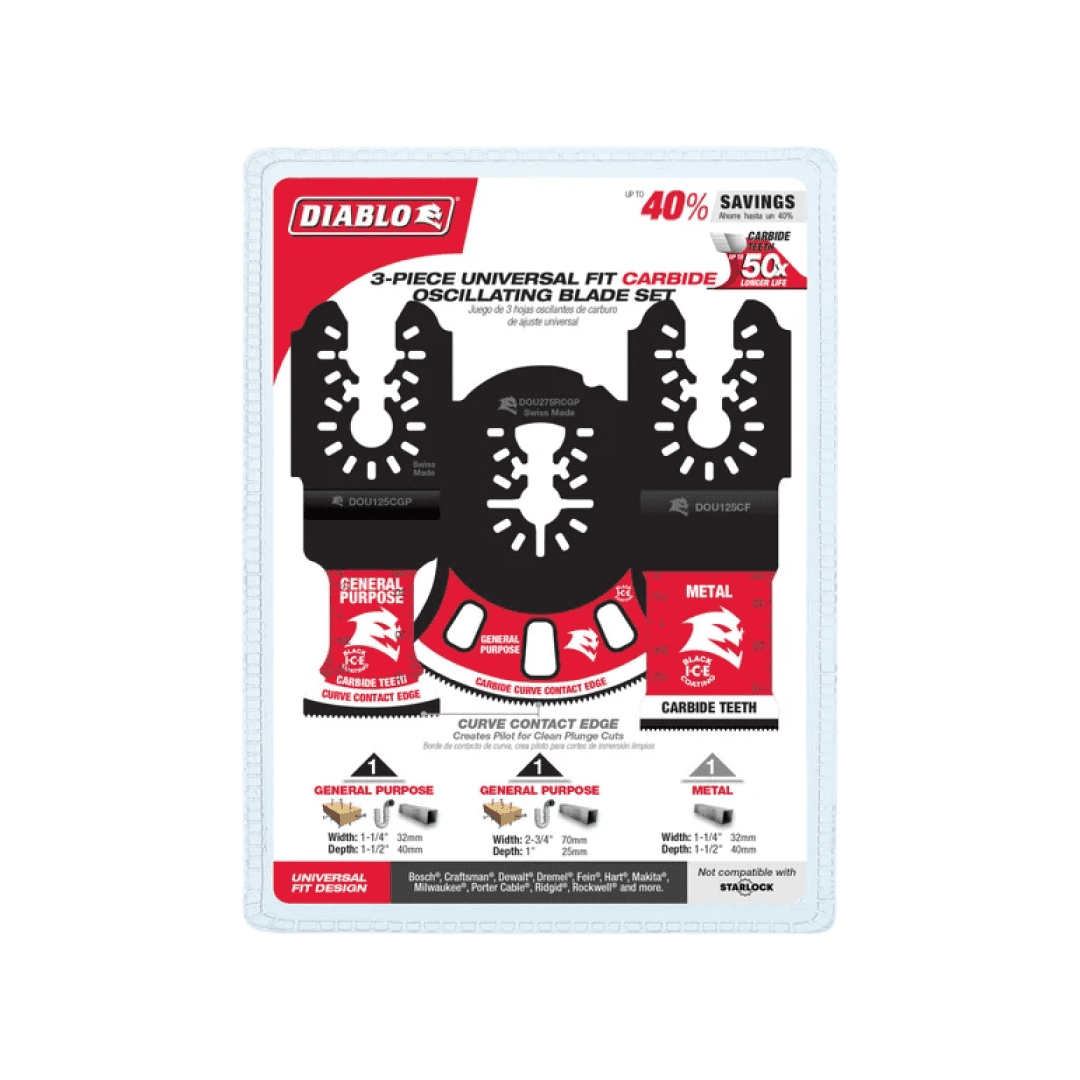 Diablo’s universal fit carbide oscillating blades feature application specific designs that deliver extreme durability and superior cutting life in multiple applications ranging from nail-embedded wood, clean wood, metal and plastics. High-performance TiCo Hi-Density carbide teeth deliver an unmatched up to 50X longer cutting life versus standard bi-metal blades. Curve contact edge creates a pilot for precise, clean plunge cuts with less vibration. An optimized blade design and Black I.C.E. (Industrial Cooling Element) protects cutting edge against wear for extreme durability and longer blade life. The blade’s universal fit, adapter-free design easily attaches to most tools, with the exception of Starlock tools.
