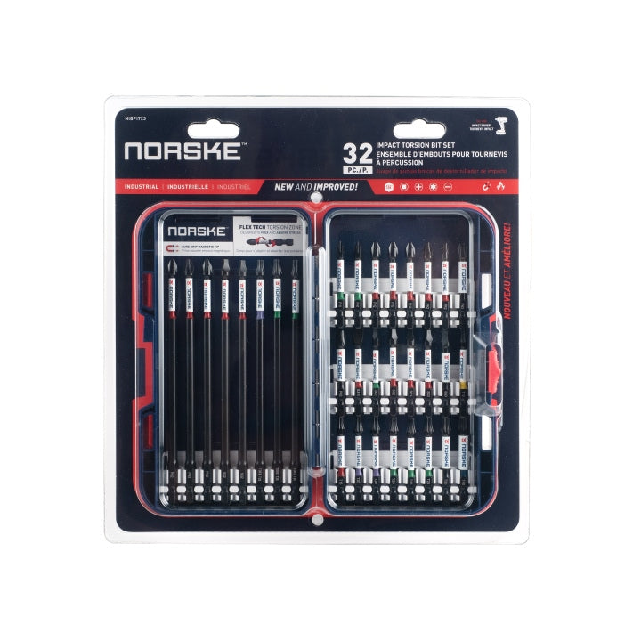 NORSKE™ IMPACT TORSION driver bits are engineered to meet the rigorous demands of professional and industrial users. The optimized FLEX TECH TORSION ZONE flexes under load to take pressure off of the bit tip and reduce bit fracture resulting in less breakage.