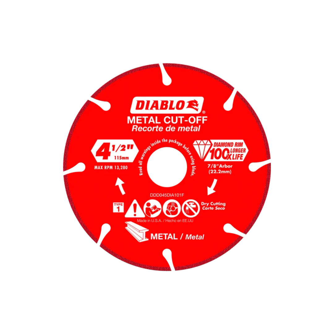 Diablo's Diamond Metal Cut-Off Discs deliver extreme durability, minimal downtime and increased productivity. These diamond rimmed wheels deliver 100X longer cutting life versus a standard bonded cut-off disc in some of the most intense metal cutting situations. The wheel's long lasting durability maximizes cutting even in extreme applications such as rebar, angle iron, cast iron and steel bar. Diablo's diamond metal cut-off wheels not only provide long lasting cutting life, durability and control, but they also allow for a safer cutting experience.