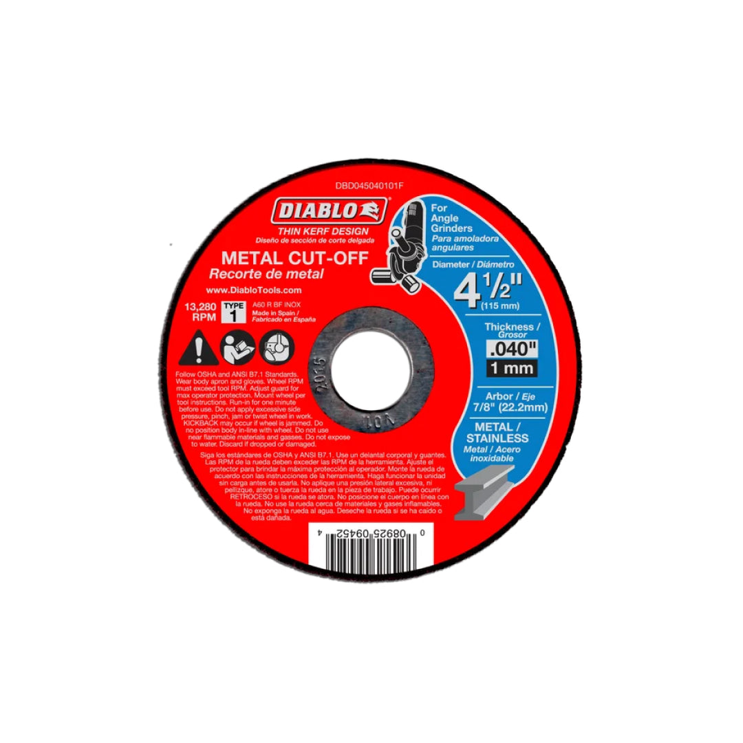 Diablo's premium metal cut-off discs provide superior performance and increased productivity. Featuring a premium aluminum oxide blend, these discs cut through material faster than other cut-off discs and offer an extra-long cutting life. Diablo's thin kerf design provides for a thin, fast cut with minimal burr formation. Unlike other bonded discs on the market, this cut-off disc is a true 0.4" design. Fully reinforced for use in hand-held cut-off work. Ideal for use when working in hard-to-reach areas.