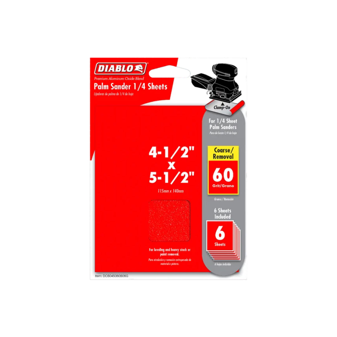 Diablo's premium Clamp-on Sanding Sheets include breakthrough innovations that improve performance, extend sanding life and increase productivity. These sanding sheets are designed for use in 1/4 sheet palm sanders and are ideal for all types of wood, metal and plastics.