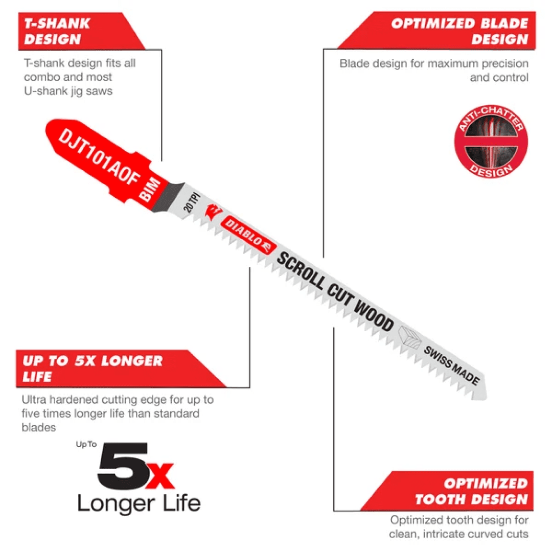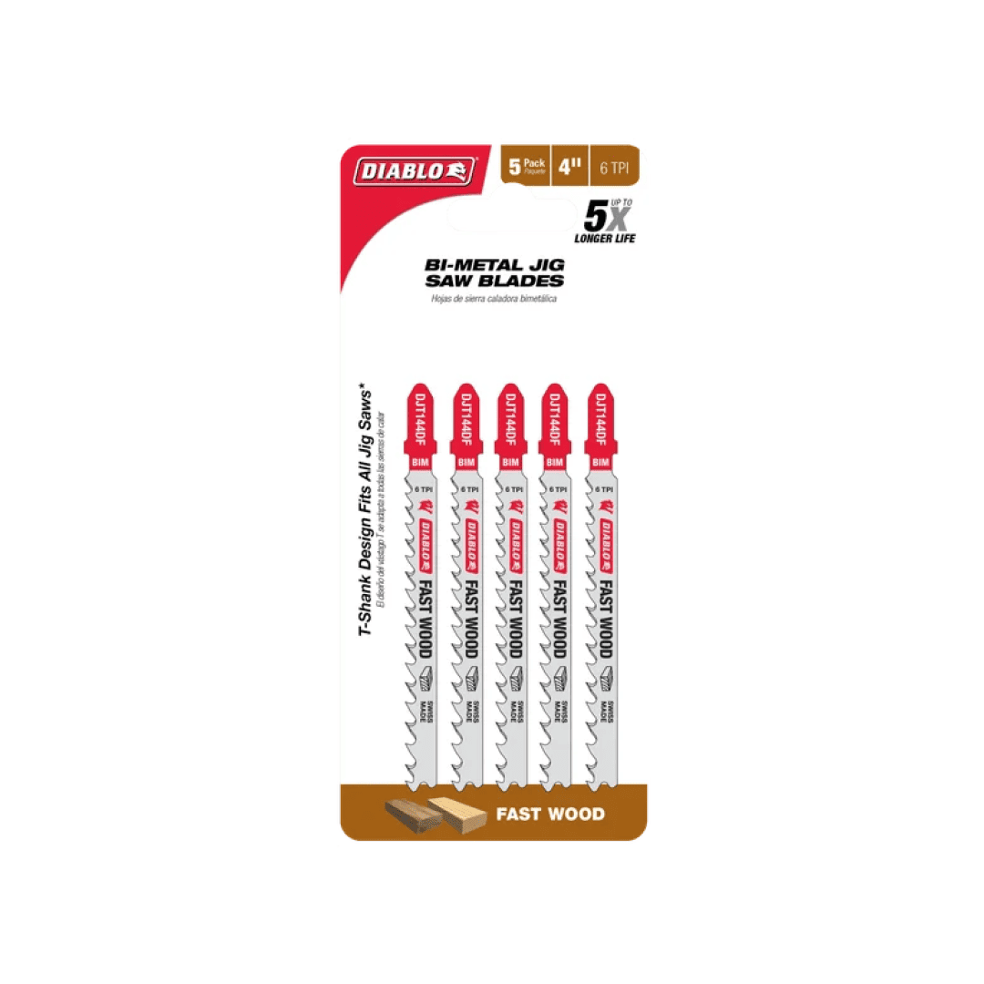 Diablo’s bi-metal teeth jig saw blades are specifically designed for maximum durability, longer life and speed in clean wood applications. These high-performance blades feature an ultra-hardened cutting edge to deliver up to 5X longer life than standard blades. The optimized blade design reduces heat and pitch build up; for fast, clean cuts. T-shank design fits all combo and most U-shank cordless and corded jig saws.