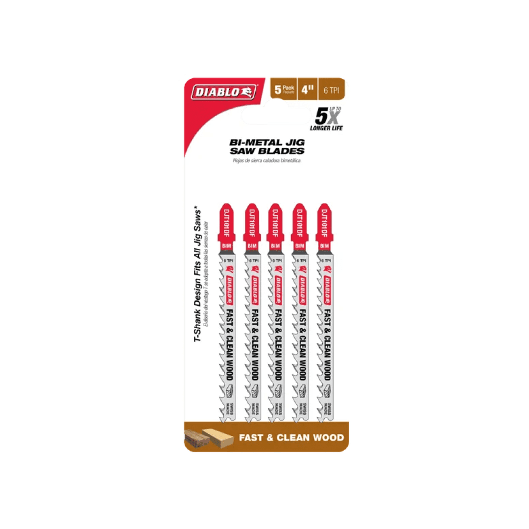 Diablo’s bi-metal teeth jig saw blades application are specifically designed for maximum durability, longer life and fast cuts in wood applications. These high-performance blades feature an ultra-hardened cutting edge to deliver up to 5X longer life than standard blades. The optimized tooth and blade designs provide fast, effortless and clean finishes. T-shank design fits all combo and most U-shank cordless and corded jig saws.