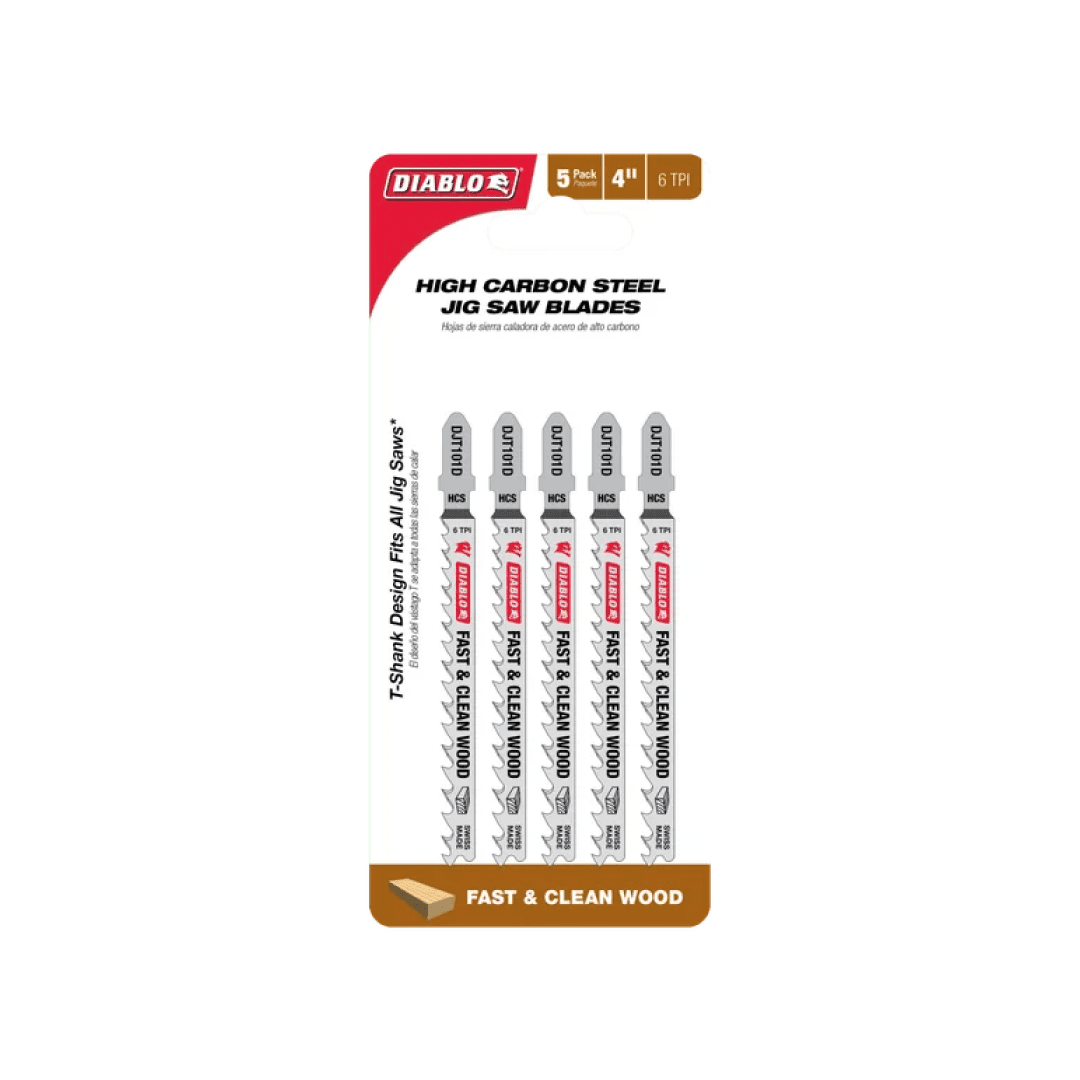 Diablo’s high carbon steel jig saw blades are specifically designed for high-performance cutting and speed in clean wood applications. A high carbon steel cutting edge provides fast and effortless cuts in soft materials. Optimized tooth design for fast, clean cuts. T-shank design fits all combo and most U-shank cordless and corded jig saws.