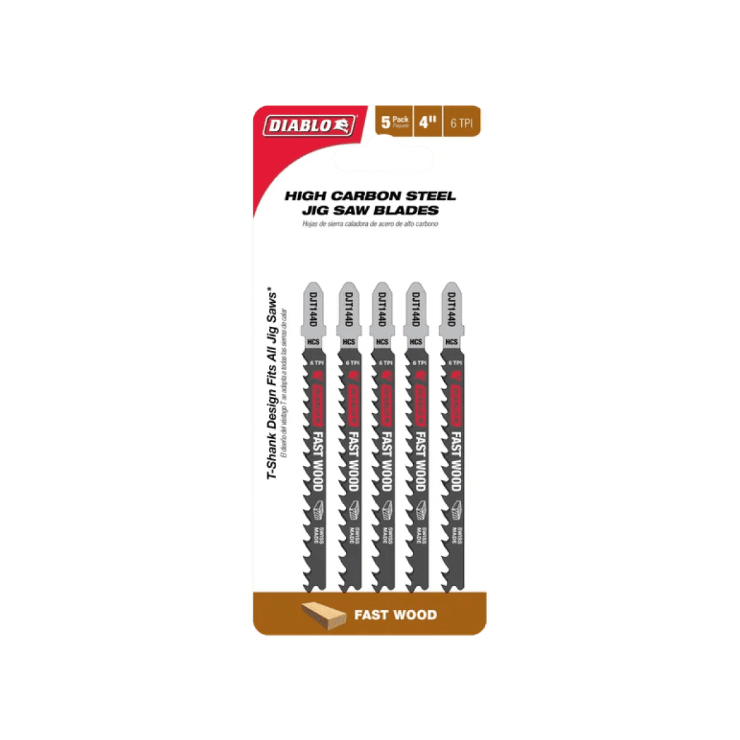 Diablo’s high carbon steel jig saw blades are specifically designed for high-performance cutting and speed in wood applications. A high carbon steel cutting edge provides fast and effortless cuts in soft materials. Optimized reversed tooth design for clean bottom finishes. T-shank design fits all combo and most U-shank cordless and corded jig saws.