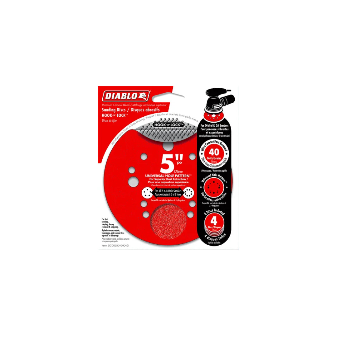 Diablo's premium universal random orbital sanding (ROS) discs with Hook & Lock™ backing include break-through innovations that improve performance, extend sanding life and increase productivity. Featuring a premium ceramic blend, these discs remove material faster than other sanding discs and offer an extra-long sanding life. Clog-SHIELD™, Diablo's own blend of grinding agents, reduces loading thus maximizing productivity. The superior grain bonding system, ENDURA-BOND™, provides Diablo's sanding discs with longer life and extreme durability.