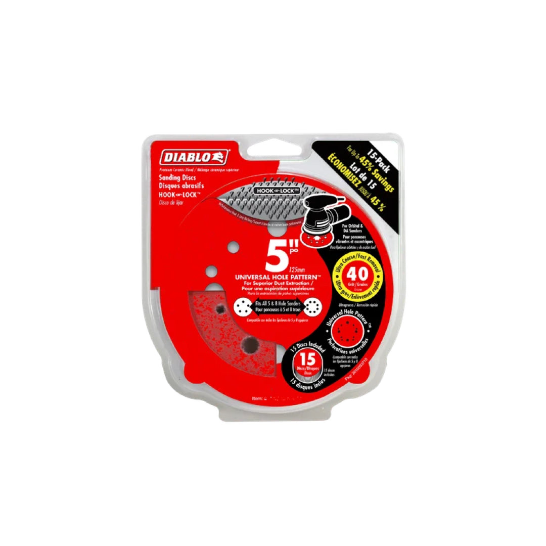 Diablo's premium universal random orbital sanding (ROS) discs with Hook & Lock™ backing include break-through innovations that improve performance, extend sanding life and increase productivity. Featuring a premium ceramic blend, these discs remove material faster than other sanding discs and offer an extra-long sanding life. Clog-SHIELD™, Diablo's own blend of grinding agents, reduces loading thus maximizing productivity. The superior grain bonding system, ENDURA-BOND™, provides Diablo's sanding discs with longer life and extreme durability.