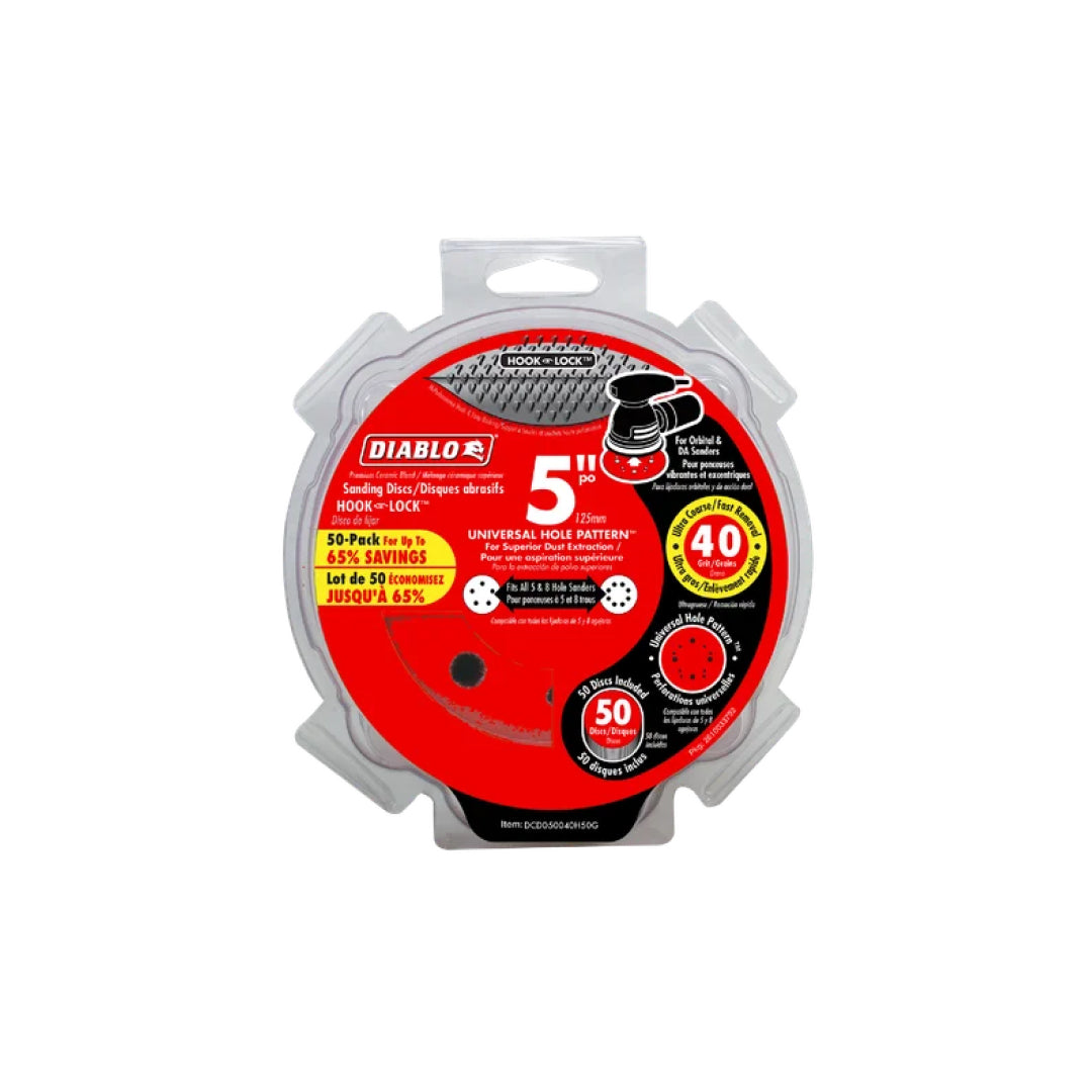 Diablo's premium universal random orbital sanding (ROS) discs with Hook & Lock™ backing include break-through innovations that improve performance, extend sanding life and increase productivity. Featuring a premium ceramic blend, these discs remove material faster than other sanding discs and offer an extra-long sanding life. Clog-SHIELD™, Diablo's own blend of grinding agents, reduces loading thus maximizing productivity. The superior grain bonding system, ENDURA-BOND™, provides Diablo's sanding discs with longer life and extreme durability.