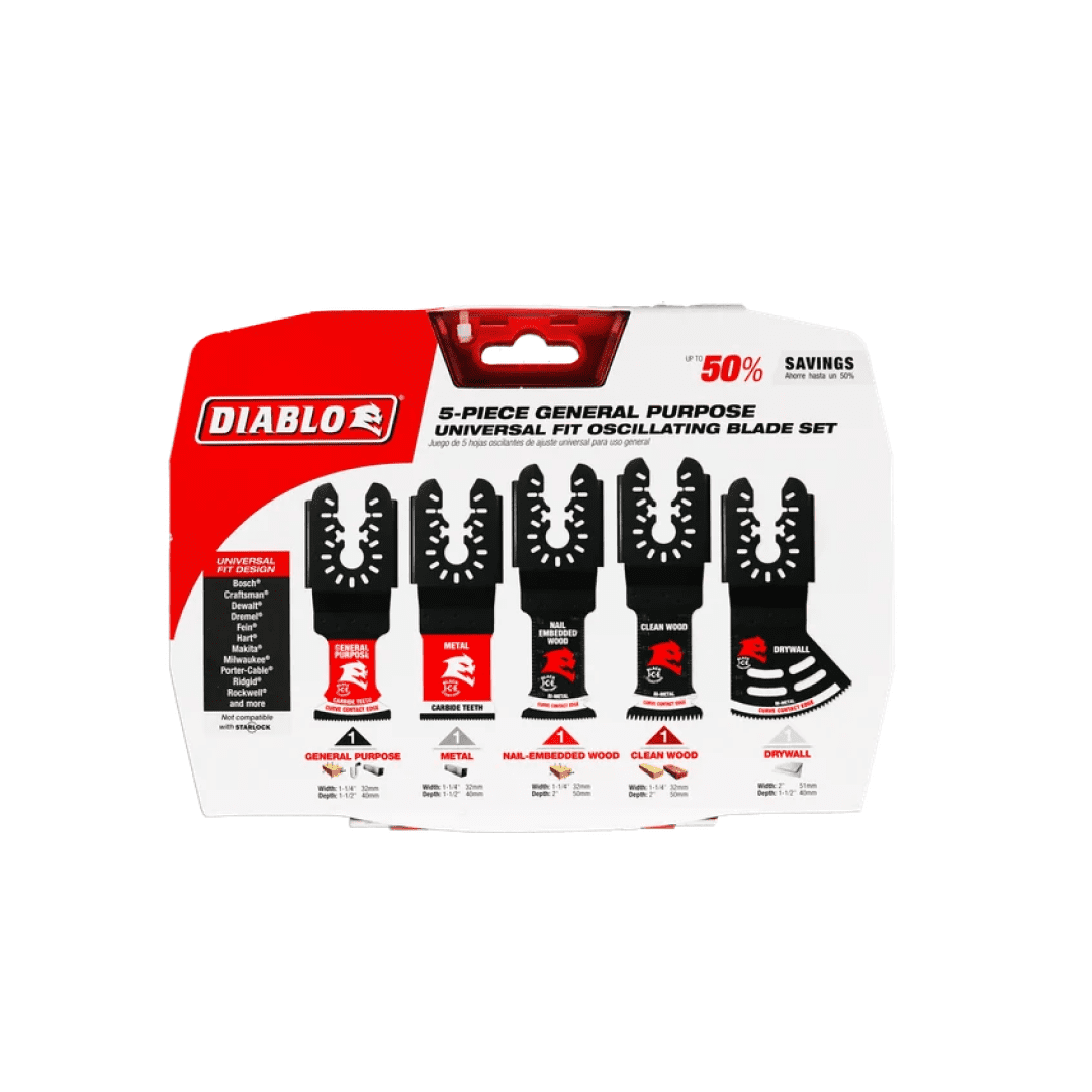 Diablo’s universal fit oscillating blade set features application specific blades ranging from nail-embedded wood, clean wood, metal, plastics and drywall. Included are high-performance TiCo Hi-Density carbide and bi-metal blades sure to deliver unmatched durability, life and quality of cut in any job. The blade’s universal fit, adapter-free design easily attaches to most tools, with the exception of Starlock tools.