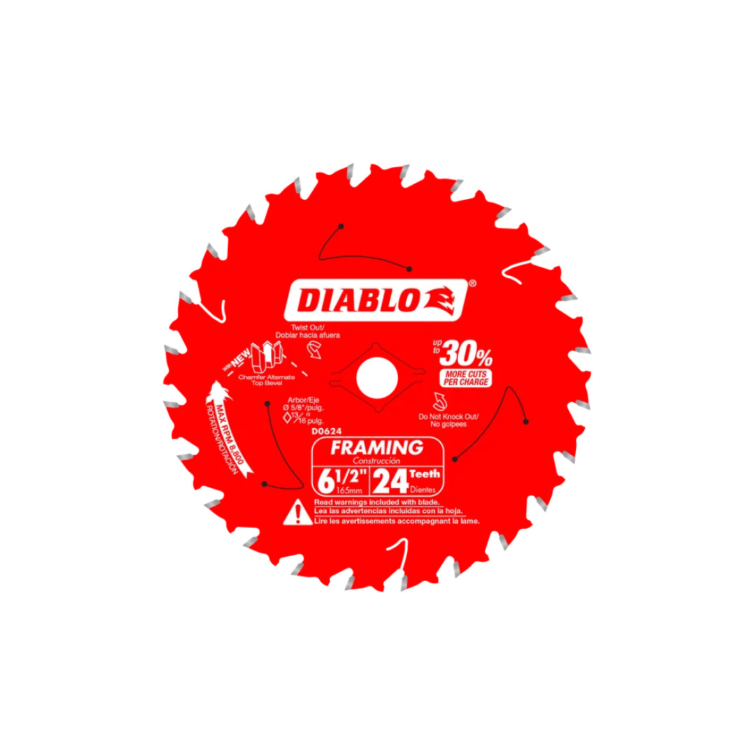 Diablo’s next generation Framing Saw Blade for Wood features industry leading technology to deliver optimum performance and control in cordless saws. The combination of Diablo’s specially formulated TiCo™ Hi-Density carbide and a Chamfer Alternate Top Bevel tooth geometry delivers maximum life and durability for up to five times longer life, two times more durability and 30% more cuts per charge. The super-thin laser cut kerf design optimizes the efficiency of the blade in cordless and corded saws. This next generation framing saw blade is ideal for framers, roofers, remodelers, concrete formers or anyone wanting ultimate cutting performance in pressure treated wood, 2x lumber, plywood, hardwoods and softwoods.