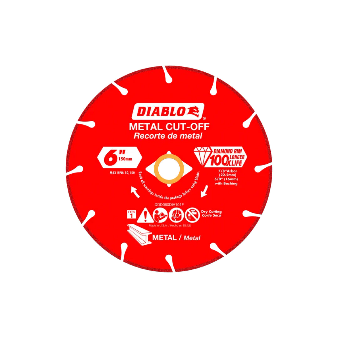 Diablo's Diamond Metal Cut-Off Discs deliver extreme durability, minimal downtime and increased productivity. These diamond rimmed discs deliver up to 100X longer cutting life versus a standard bonded cut-off disc in some of the most intense metal cutting situations. The disc's long-lasting durability maximizes cutting even in extreme applications such as rebar, angle iron, cast iron and steel bar. Diablo's diamond metal cut-off discs not only provide long lasting cutting life, durability and control, but they also allow for a safer cutting experience.
