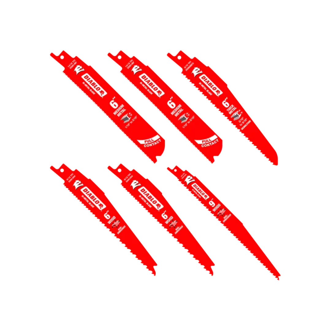 - Set includes (1) 6" 8/10TPI metal demolition (1/8" to 1/2") blade, (6) 6" 14/18TPI metal cutting (3/32" to 5/16") blades, (2) 6" 6/12TPI nail-embedded wood blades and (1) 9" 6/12TPI nail-embedded wood blade