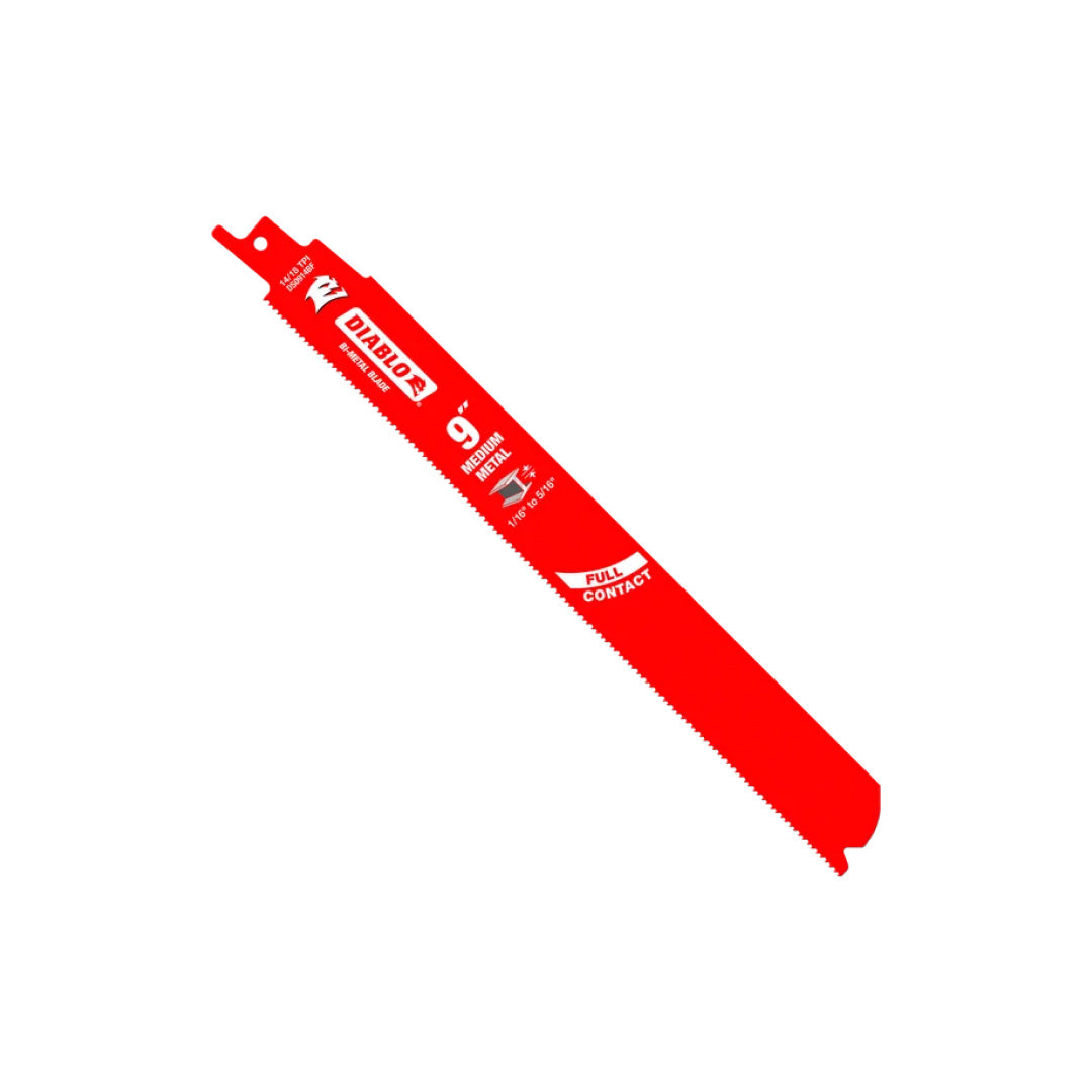 Diablo's bi-metal reciprocating saw blades for medium metal with Full Contact Arched Design are specifically designed for maximum performance in metal cutting applications, including angle tubing and metal ranging between 1/16" and 5/16" in thickness. The blade’s oversized design with an ultra-hardened cutting edge provides faster and more rigid cuts in fewer passes. Diablo's Perma-SHIELD® non-stick coating protects the blade from heat buildup. All combined benefits provide up to 5X longer blade life compared to standard bi-metal blades