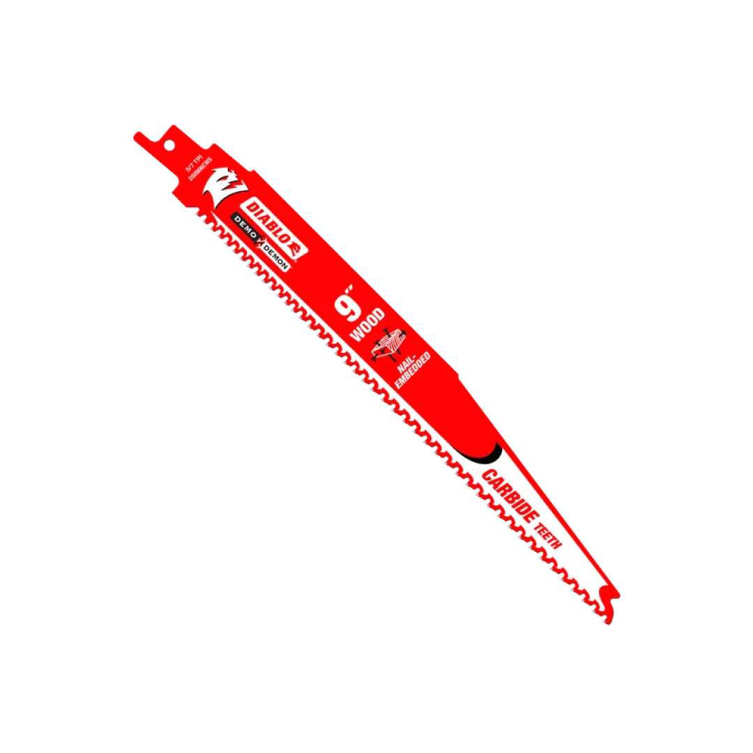 Diablo's Demo Demon™ Carbide Teeth Reciprocating Saw Blades for Nail-Embedded Wood for Nail-Embedded Wood with new Variable Tooth Design are specifically designed for maximum performance and superior results. This high performance TiCo Hi-Density carbide-tipped blade delivers up to 50X longer cutting life in nail-embedded wood compared to standard bi-metal blades. These radical blades also feature Perma-SHIELD® non-stick coating to prevent gumming and friction for fast, effortless cuts in some of the toughest wood cutting scenarios. An oversized blade body helps create straighter cuts with less vibration while a unique plunge tip design enables faster starts.