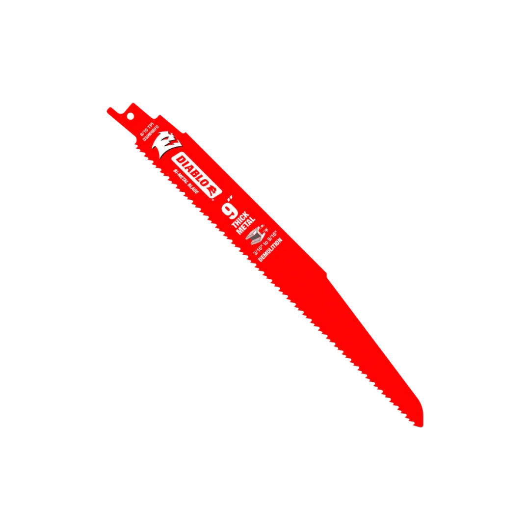 Diablo's Bi-Metal Reciprocating Saw Blades for Thick Metal are specifically designed for maximum performance in metal demolition applications. The blade's ultra-hardened cutting edge delivers up to 5X longer life compared to standard bi-metal blades. Dual Tooth design features a double tooth configuration with small gullets for faster material removal and extra durability. An oversized 1" blade body delivers straighter cuts with less vibration and chatter while Perma-SHIELD non-stick coating protects the blade from heat buildup, preventing gumming and corrosion.