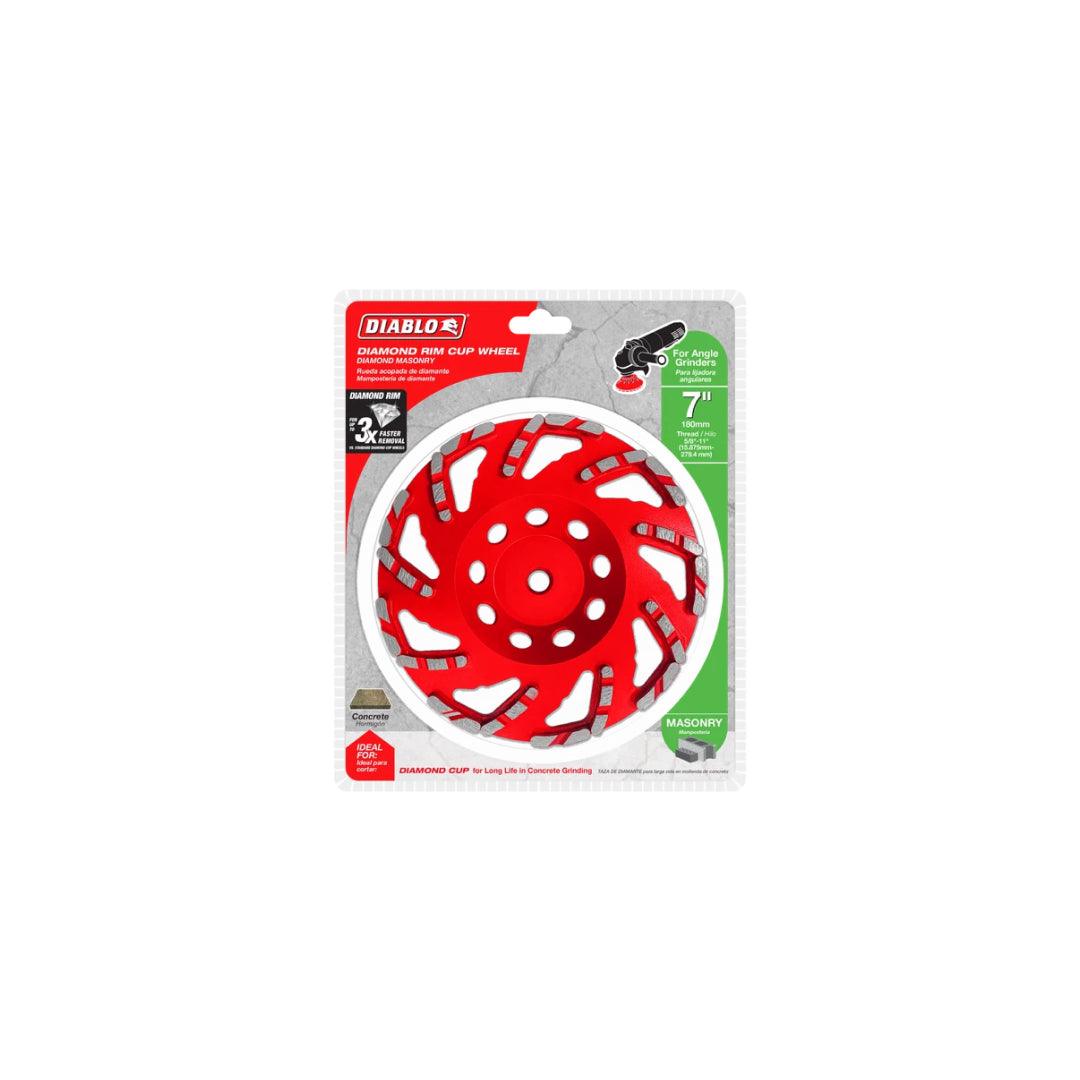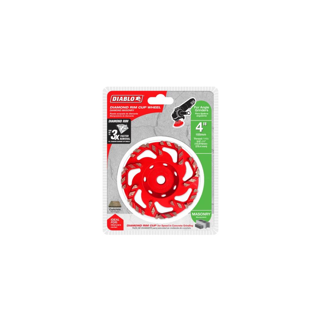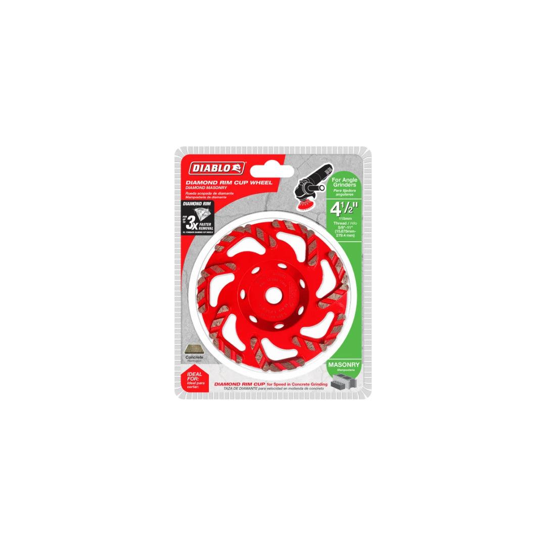 Diablo's Diamond Rim Cup Wheels for Masonry provide extreme durability, faster cuts and longer life in concrete grinding applications. These superior performing diamond cup wheels deliver up to 3X faster material removal versus standard diamond cup wheels. Extra-wide slots provide maximum dust extraction while the L-shaped diamond segments avoid gouging and swirl marks. Industrial-grade diamonds deliver lasting durability and maximizes quality in extreme applications.