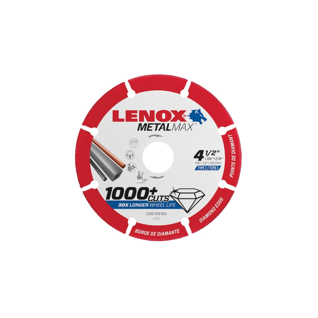 Lenox MetalMax Diamond Edge Cutoff Wheel, 4.5" x 7/8", is an alternative to bonded abrasive cut-off wheels. Breakthrough diamond technology delivers 1,000 or more cuts and 30X longer life than thin bonded cutoff wheels* without sacrificing speed or finish. Made of solid steel to greatly reduce the risk of breakage, the combination of a steel body with a diamond edge allows MetalMax to hold its original wheel diameter until the last cut, meaning better control, reach, and cut precision throughout the wheel life. The enhanced design substantially reduces dust particles and lessens odor. Lenox MetalMax is suitable for metal cutting applications including steel, sheet metal, stainless steel, rebar, cast iron, aluminum** and non-ferrous metals, and works at the same speeds and feeds as thin bonded abrasive wheels.͍*Average performance in 1” carbon steel square tube vs. thin bonded abrasive cutoff wheels.͍**Cutting wax or saw lubricant is recommended to avoid chip welding when cutting aluminum.