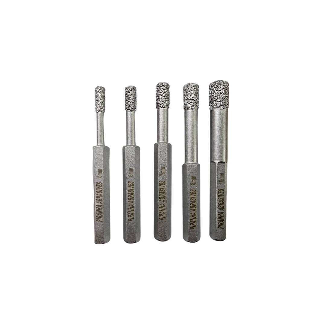The PAVBDB 5 PC HEX SHAFT SET is the ultimate value package Piranha Abrasives has to offer. The kit includes 5 of our most popular sized Vacuum Brazed Coring Bits, designed for a drill with a 6mm Hex Shaft.