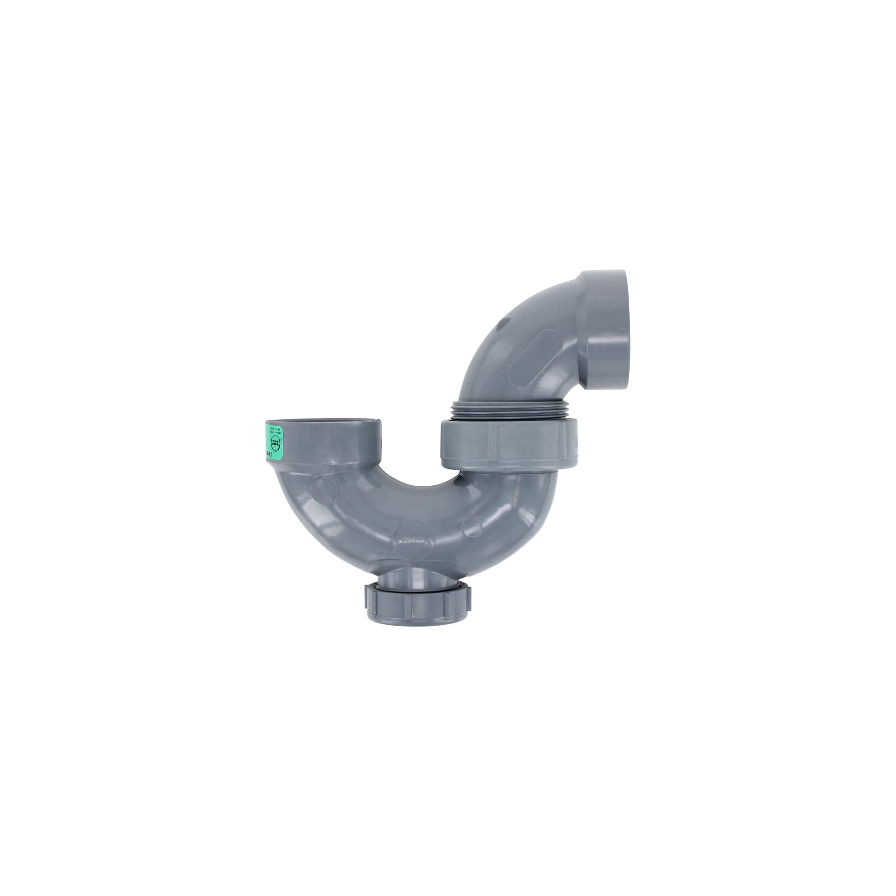 Made for a connection to a vertical strainer tail pipe under a sink, the p-trap with union connection with Cleanout provides a horizontal transition to the DWV piping system while traping water in the lower half of the p-trap u-bend for preventing the release of sewer gas into the environment through the sink drain. A union connection to the u-bend and a cleanout plug with a reusable watertight gasket allow for cleaning of the p-trap.