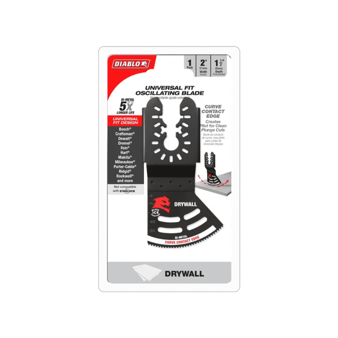 Diablo’s universal fit bi-metal oscillating blades feature application specific designs that deliver maximum durability and longer life in drywall. These high-performance blades feature an ultra-hardened cutting edge to deliver up to 5X longer life than standard blades. Curve contact edge creates a pilot for precise, clean plunge cuts with less vibration. Black I.C.E. (Industrial Cooling Element) kcoating protects cutting edge against wear for extreme durability and longer blade life. The blade’s universal fit, adapter-free design easily attaches most tools, with the exception of Starlock tools.
