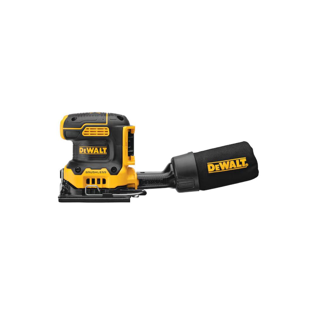 The 20V MAX XR brushless cordless 1/4 sheet variable speed sander provides you with the power and run-time needed to get the job done. A variable-speed dial provides speed control from 8,000 OPM to 14,000 OPM for a variety of jobs. 1-handed locking dust bag attaches securely to the sander to aid in dust collection or the user can attach the sander directly to the DWV010 or DWV012 dust collectors (sold separately). Rubber over mold grip provides comfortable sanding. Paper clamp designed to hold paper securely and for ease of installation. Battery and charger sold separately.