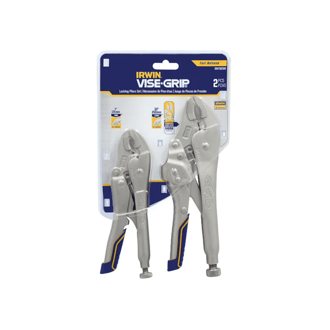 The IRWIN® VISE-GRIP® Fast Release™ 2-Piece Locking Pliers Set features high-grade, heat-treated alloy steel construction for maximum toughness and durability. The hardened teeth are designed to grip from any angle and a have a one-handed triggerless release. 20% Reduced Hand Span1 improves user control and helps reduce hand strain* (10" model) . The set includes 10WR and 7WR locking pliers to suit a wide assortment of needs.