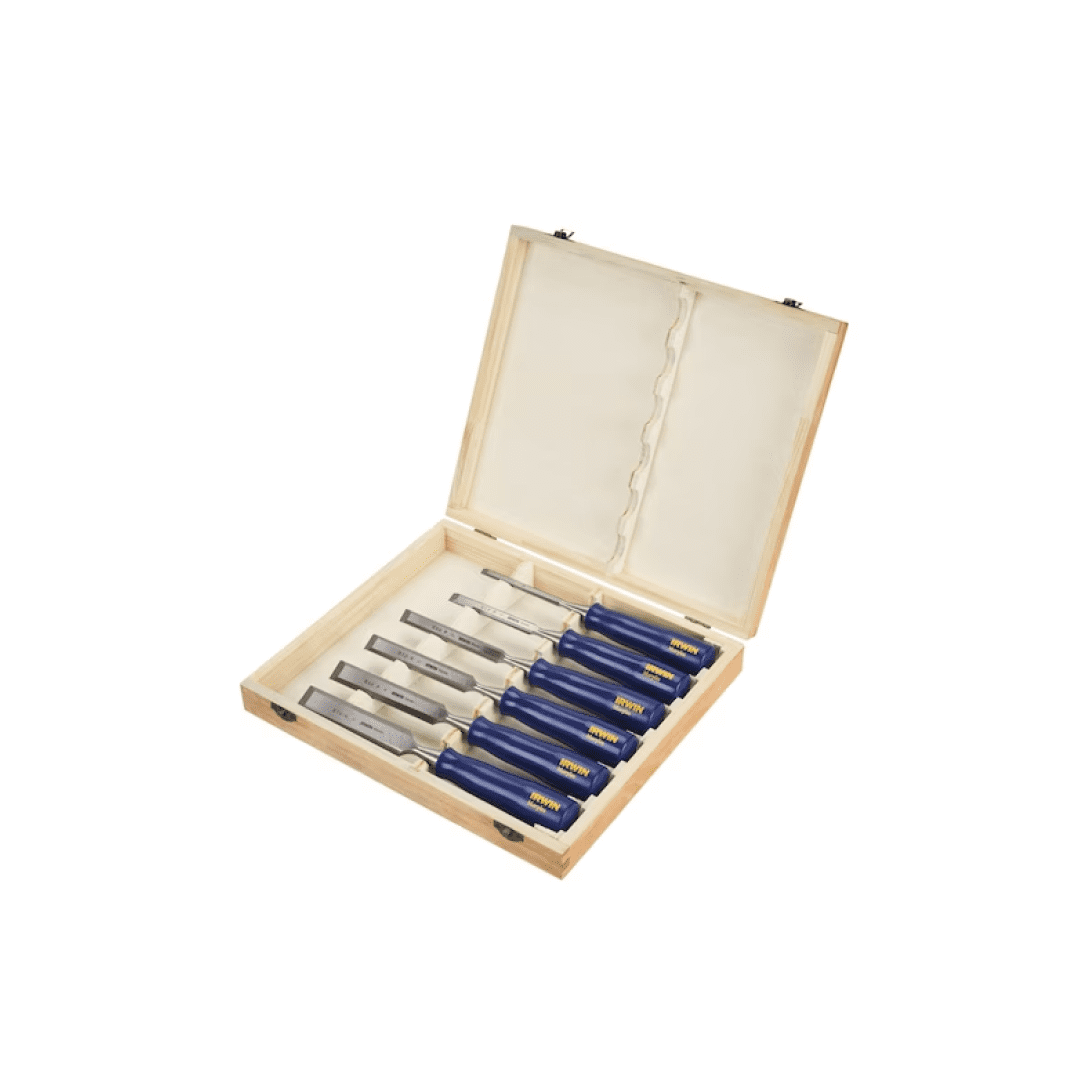 The IRWIN Marples Woodworking Chisel Set, is ideal for traditional fine woodworking applications with high-carbon steel blades hardened to 58-HRC to keep a sharper edge longer and slim contoured handles that allow these chisels to be used with a mallet or the palm of the hand. This set includes 1/4", 3/8", 1/2", 5/8", and 1" chisels and a wooden carrying case.