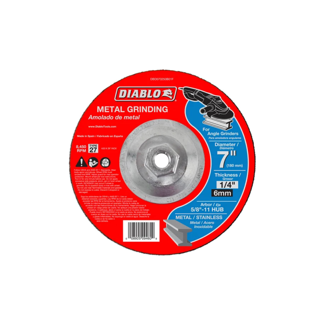 Diablo's premium metal grinding discs provide superior performance and increased productivity. Featuring a premium aluminum oxide blend, these discs grind through material faster than other discs and offer an extra long grinding life. Fully reinforced for use in hand-held cut-off work. Ideal for use when working in hard to reach areas.