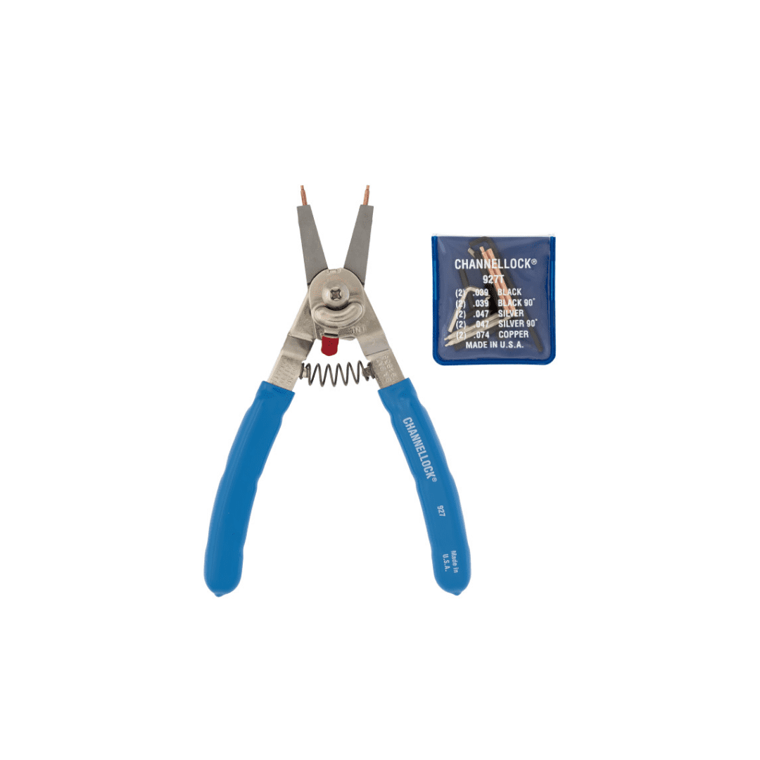 The CHANNELLOCK® 927 8" Retaining Ring Pliers easily convert from working with external to internal snap rings with a simple switch of a tab. The heavy duty return spring reduces hand fatigue and provides increased accuracy when applying or removing snap rings. CHANNELLOCK® Retaining Ring Pliers are 100% made in USA and include 5 pairs of interchangeable tips.