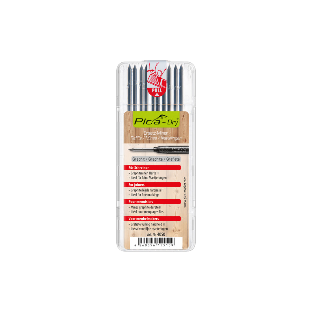 Graphite leads in special hardness H for precise markings. Particularly suitable for working with wood. Cannot be used on glass-smooth, shiny surfaces.