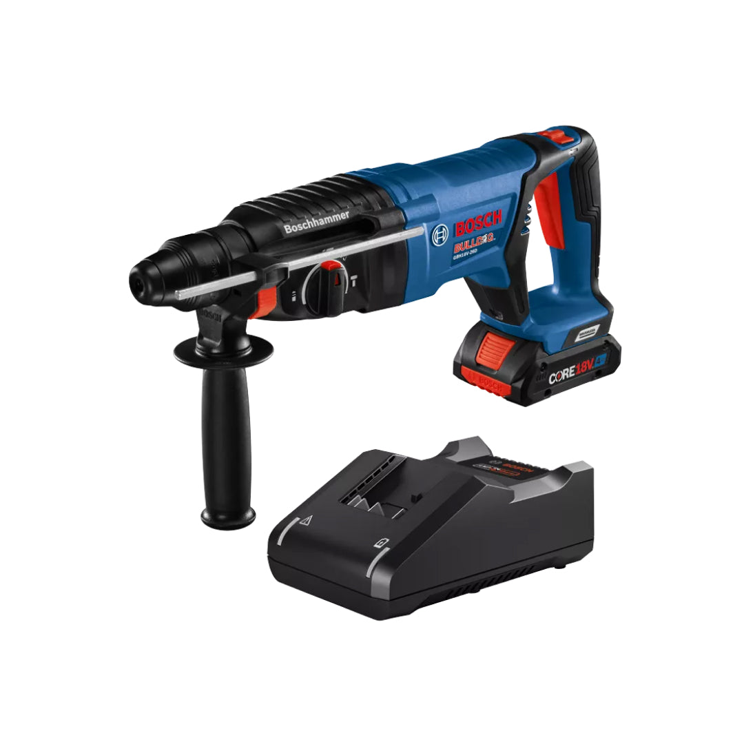 This Bosch D-handle Bulldog™ hammer consistently outperforms the best-selling 1 In. corded 11255VSR Bulldog™, making it better than the best. The GBH18V-26DK15 18V EC Brushless SDS-plus® Bulldog™ 1 In. Rotary Hammer Kit features a hammer that delivers 1.9 Ft.-Lbs. of impact energy, based on the industry standard of measurement agreed upon by the European Power Tool Association (EPTA). It weighs only 5.8 Lbs. (tool only, not including battery), delivering superior performance and an outstanding impact-to-weight ratio. The kit features a CORE18V Advanced Power Battery, which has next-gen Li-ion 21700 cell technology for extended performance in lightweight, high-power battery. The hammer’s EC Brushless motor maximizes battery runtime for extended performance. The tool features a jobsite-proven D-handle design with soft-grip and is ideal for overhead, horizontal and downward drilling applications. It also has KickBack Control, an integrated sensor to stop tool rotation in bind-up situations. The hammer features a variable-speed reversing trigger for accurate bit starting.