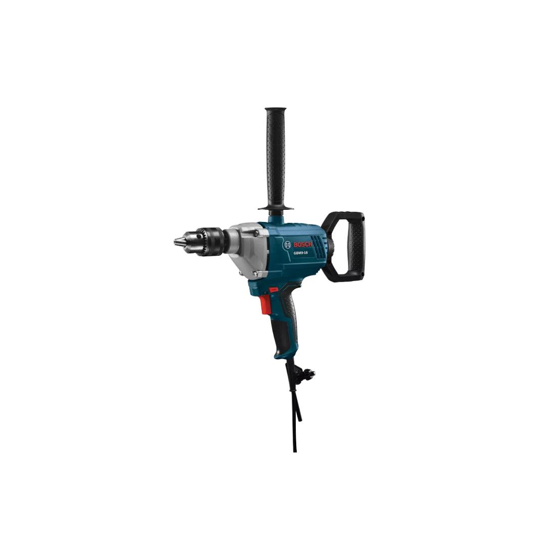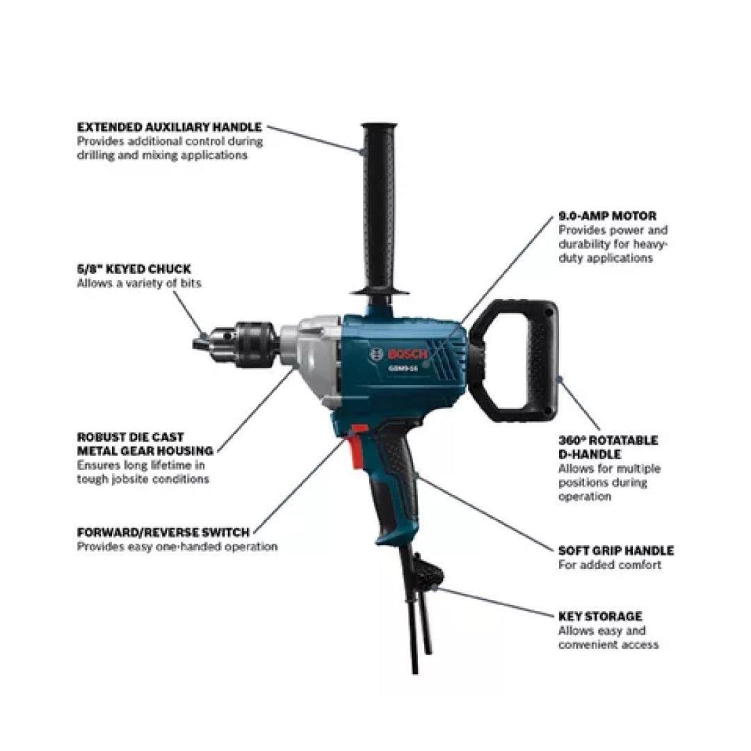 The Bosch GBM9-16 Mixer handles a wide variety of materials, from paint to plaster and more. It has variable speed control, and it has both forward and reverse operation at 0-700 no-load RPM. The all-ball bearing motor and precision-cut steel gears deliver plenty of power for high-torque mixing jobs. Higher speed is best for materials with low viscosity such as paint or sealing compounds. Lower speed, higher torque mixing works for mortar or epoxy resin. It features a 360° rotatable D handle, for maximum comfort. It diminishes vibration while allowing the user to adjust to the desired position. The heavy-duty 5/8 In. keyed chuck allows the tool to support a large variety of accessories. It features a tough, lightweight magnesium front housing for durability. It has a two-finger trigger design for easier mixing.