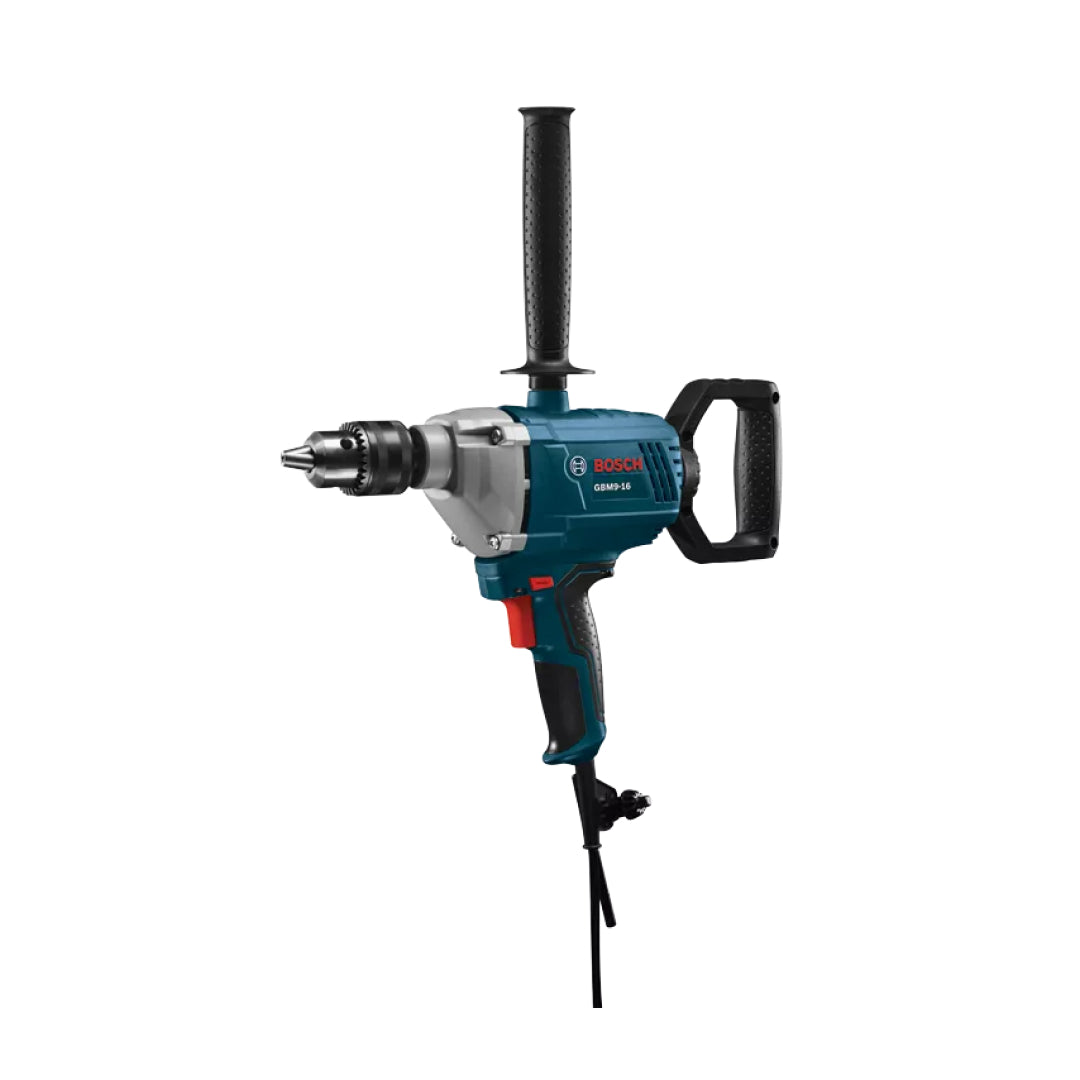 The Bosch GBM9-16 Mixer handles a wide variety of materials, from paint to plaster and more. It has variable speed control, and it has both forward and reverse operation at 0-700 no-load RPM. The all-ball bearing motor and precision-cut steel gears deliver plenty of power for high-torque mixing jobs. Higher speed is best for materials with low viscosity such as paint or sealing compounds. Lower speed, higher torque mixing works for mortar or epoxy resin. It features a 360° rotatable D handle, for maximum comfort. It diminishes vibration while allowing the user to adjust to the desired position. The heavy-duty 5/8 In. keyed chuck allows the tool to support a large variety of accessories. It features a tough, lightweight magnesium front housing for durability. It has a two-finger trigger design for easier mixing.